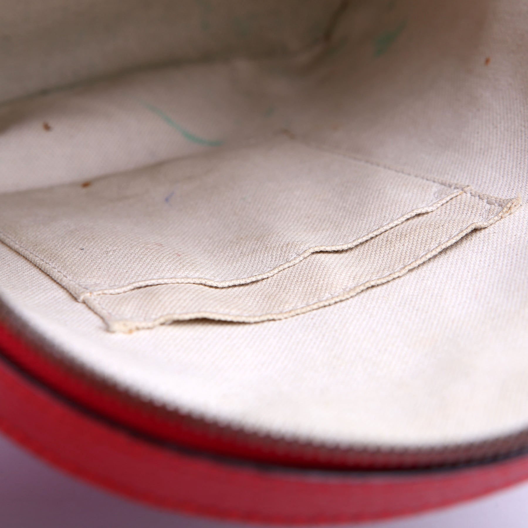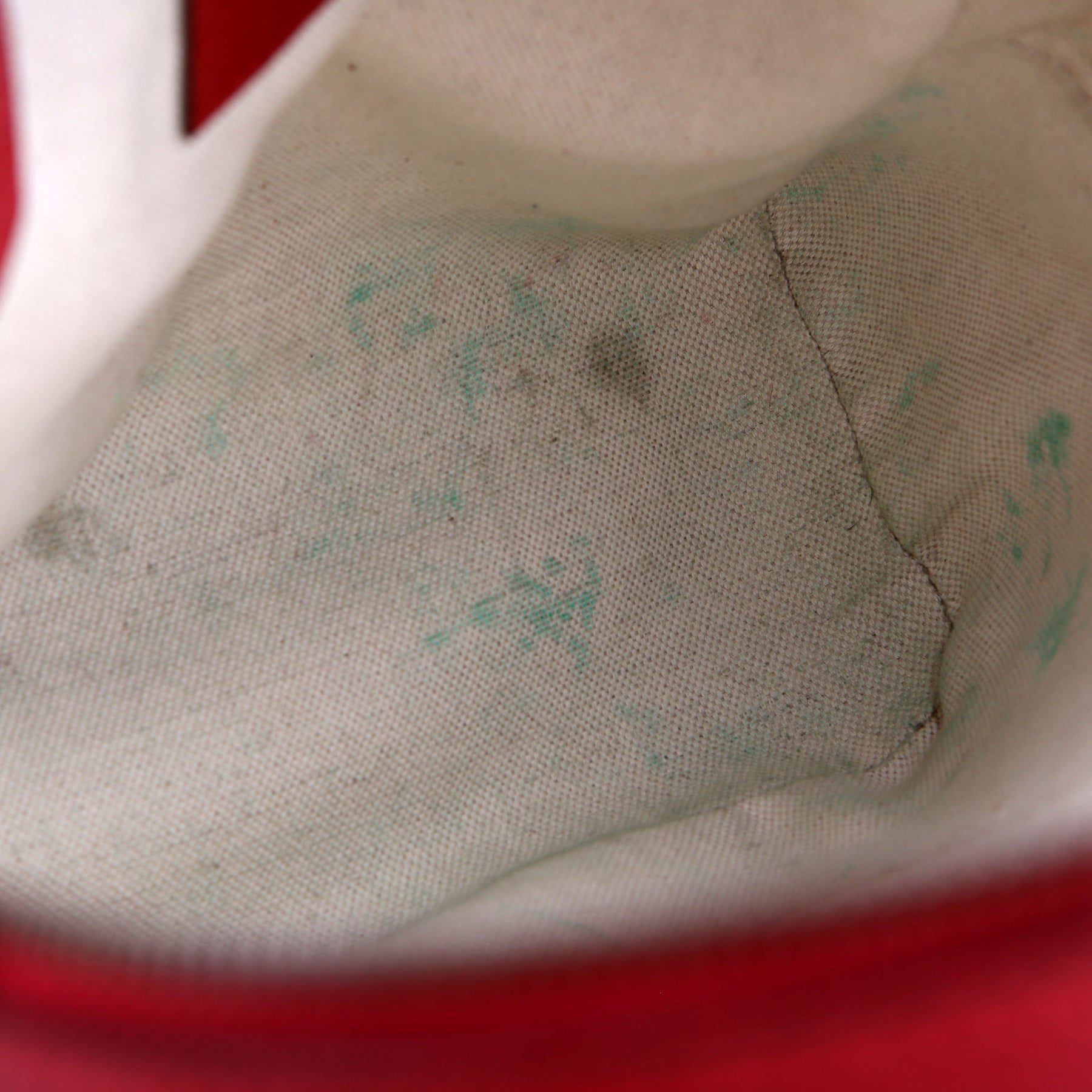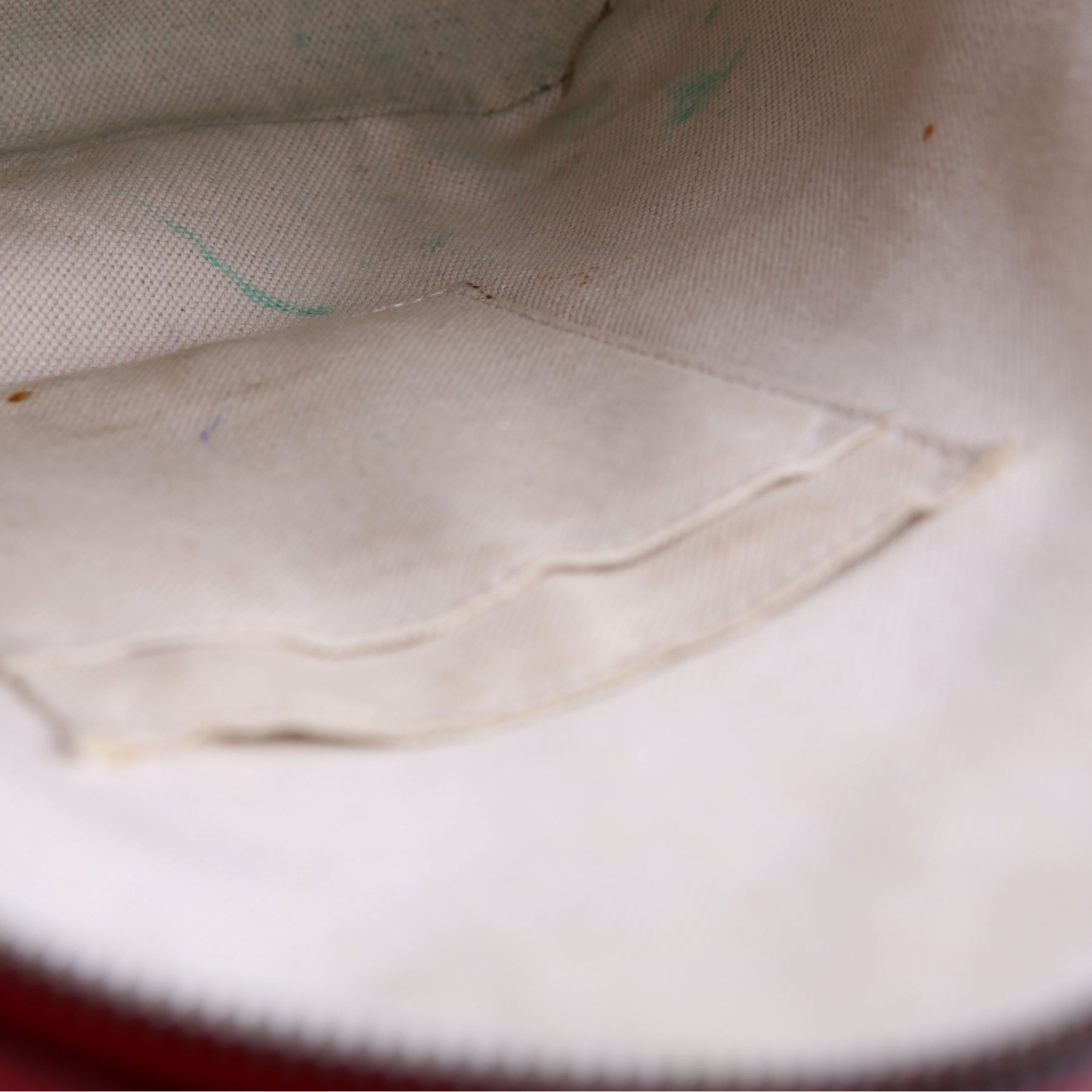 Interior: The interior has ink stains throughout and it features two open pockets and one zip closure pocket.