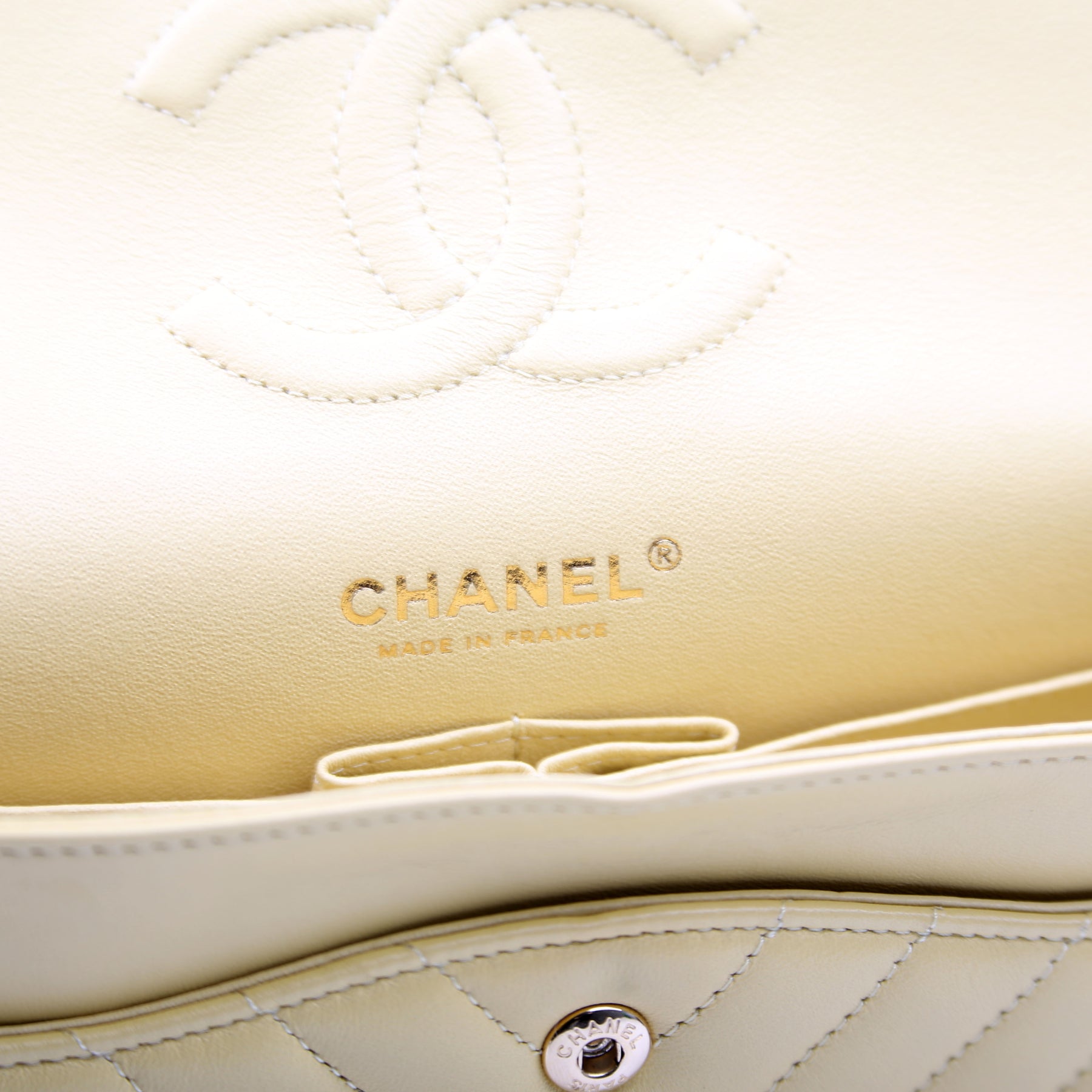 This pre-owned Chanel Classic Flap Medium Chevron is guaranteed 100% authentic. The exterior is in the classic Chanel Lambskin leather.