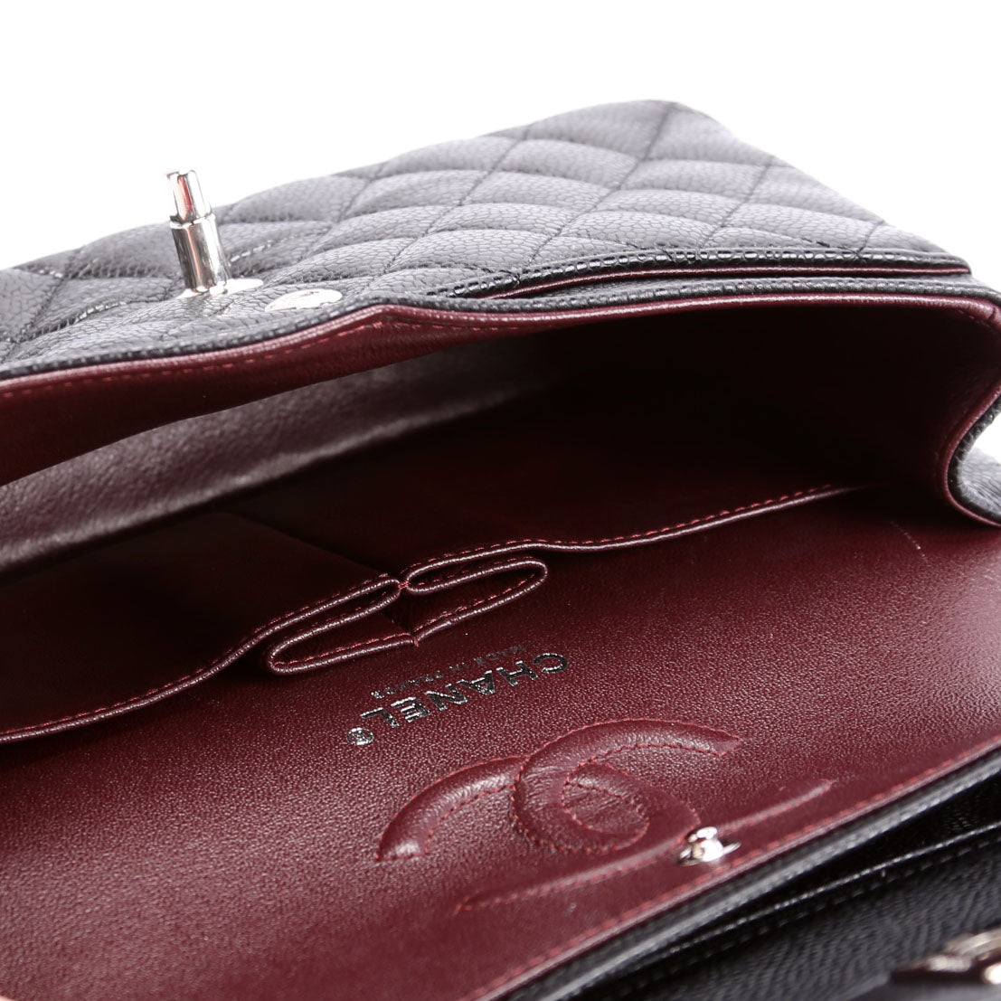 This pre-owned Chanel Classic Flap Small is guaranteed 100% authentic. The exterior is in the classic Chanel Caviar leather.