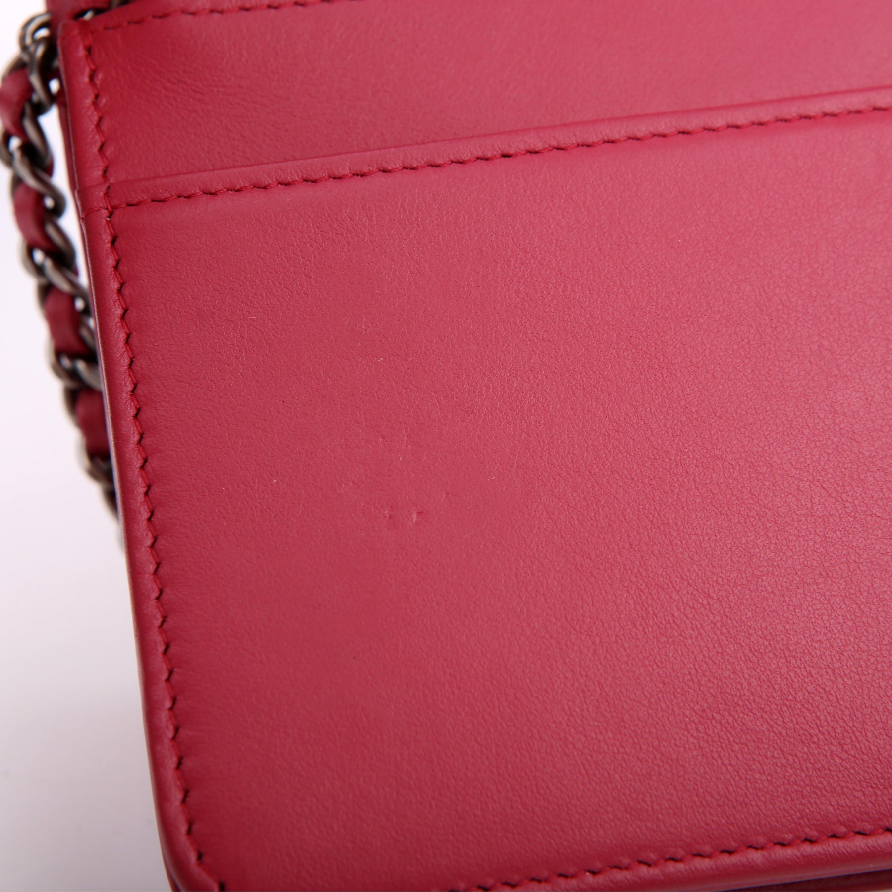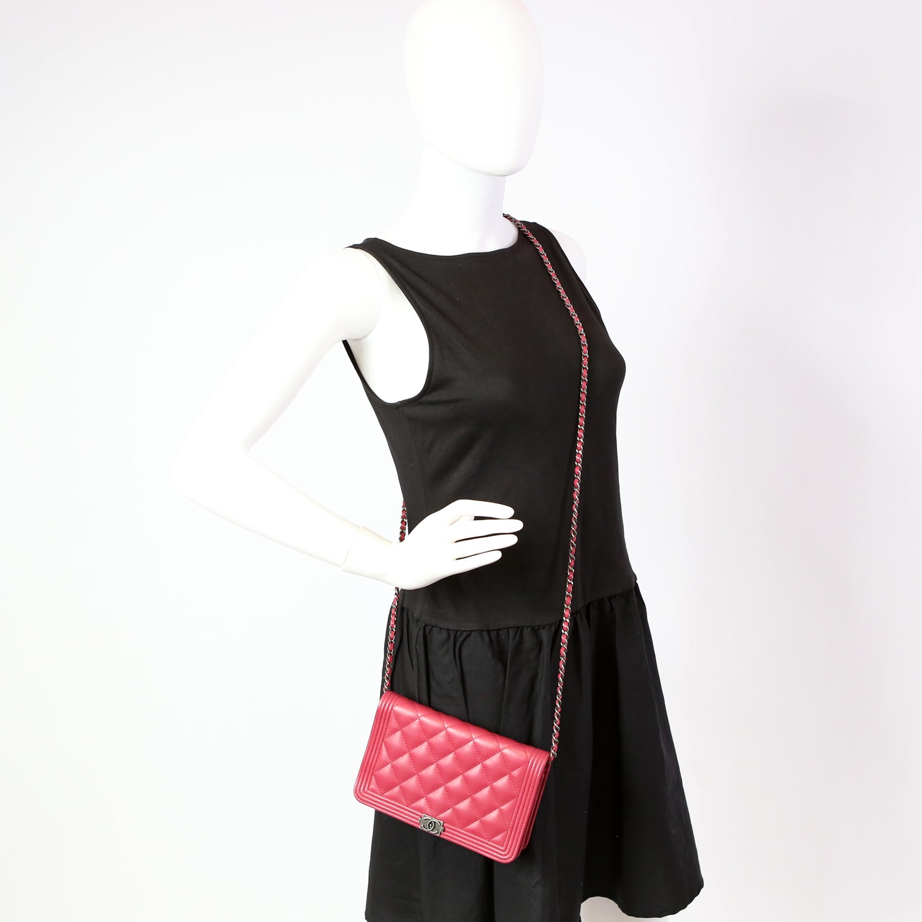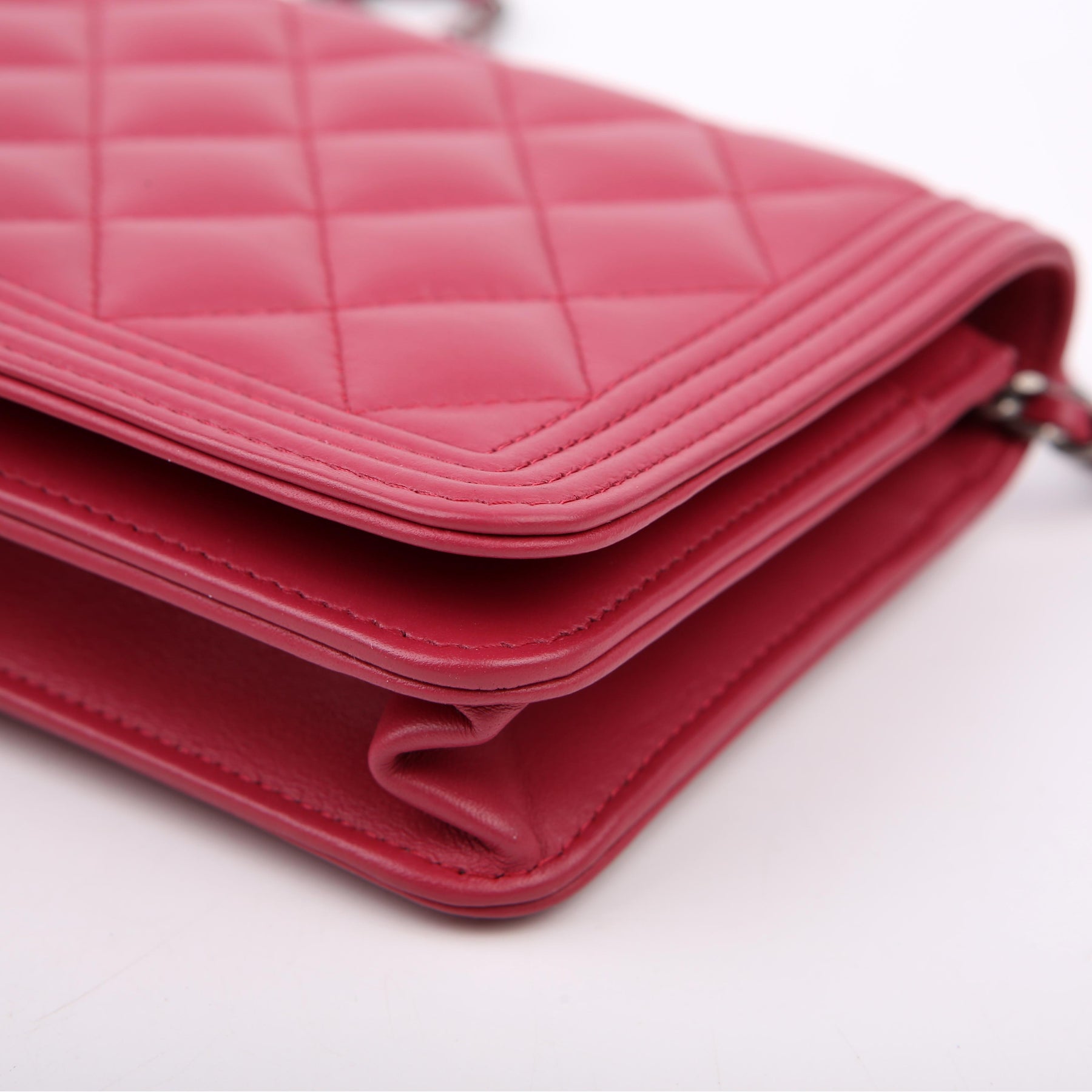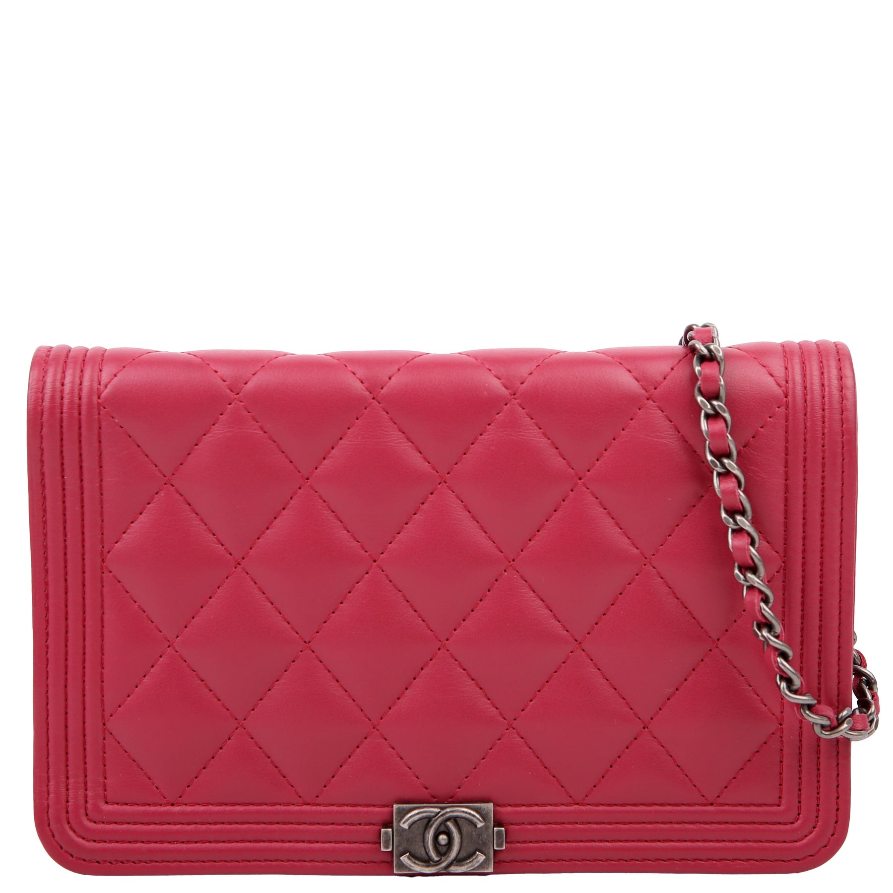 This pre-owned Chanel WOC Boy is guaranteed 100% authentic. The exterior is in the classic Chanel Lambskin leather.