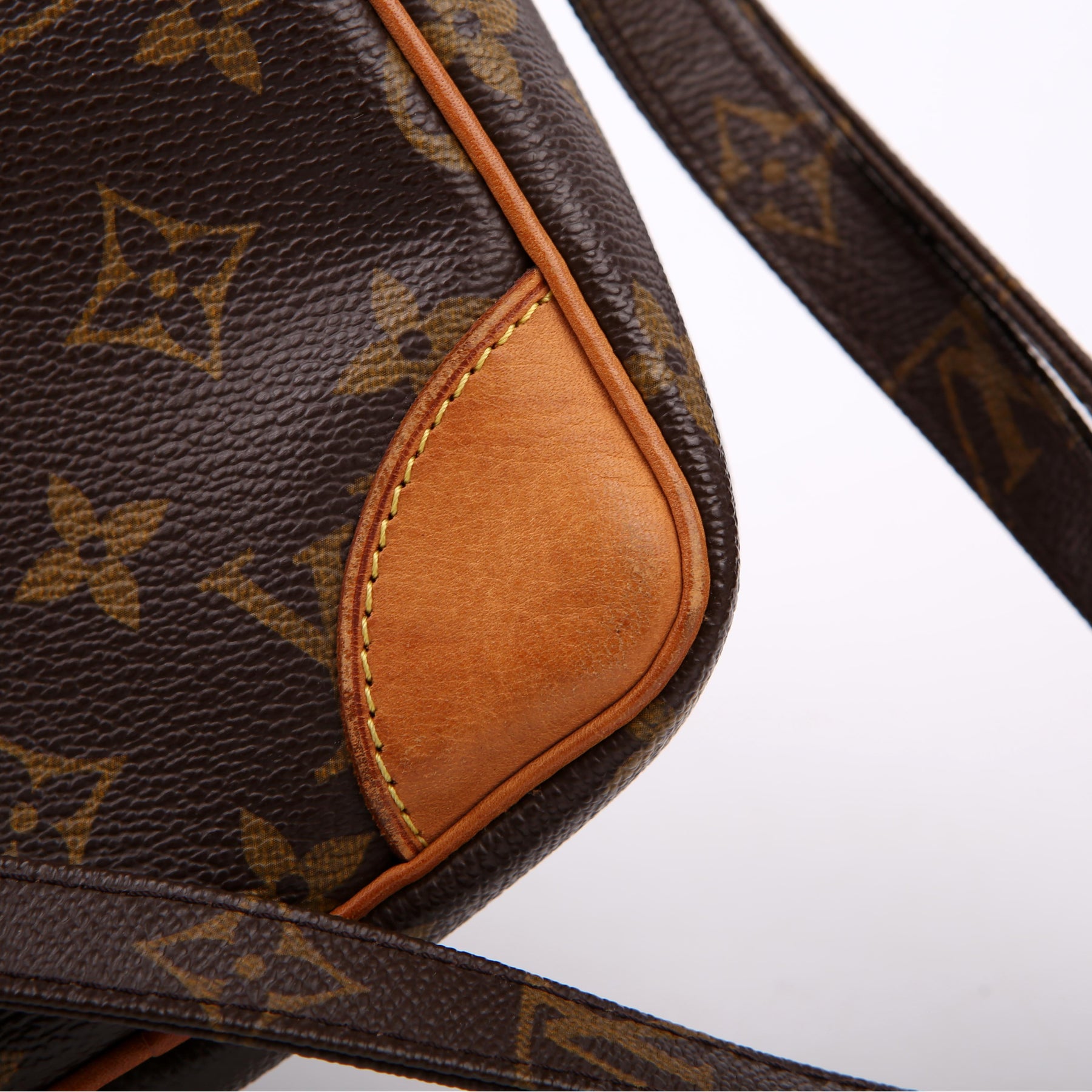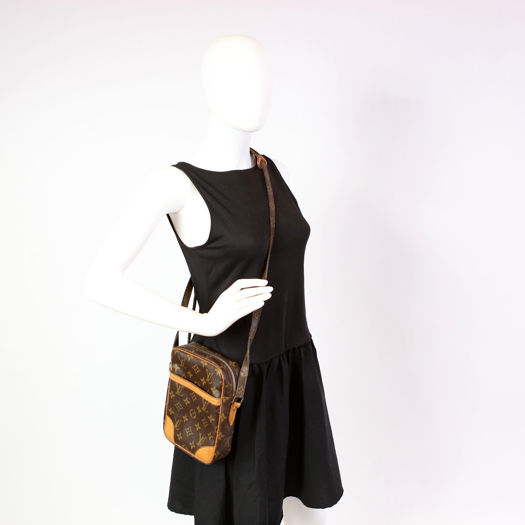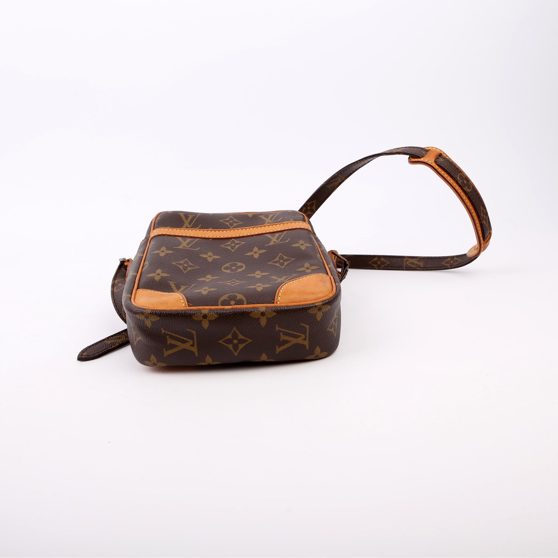 This pre-owned Louis Vuitton Danube is guaranteed 100% authentic. The exterior is in the classic Louis Vuitton Monogram coated canvas.