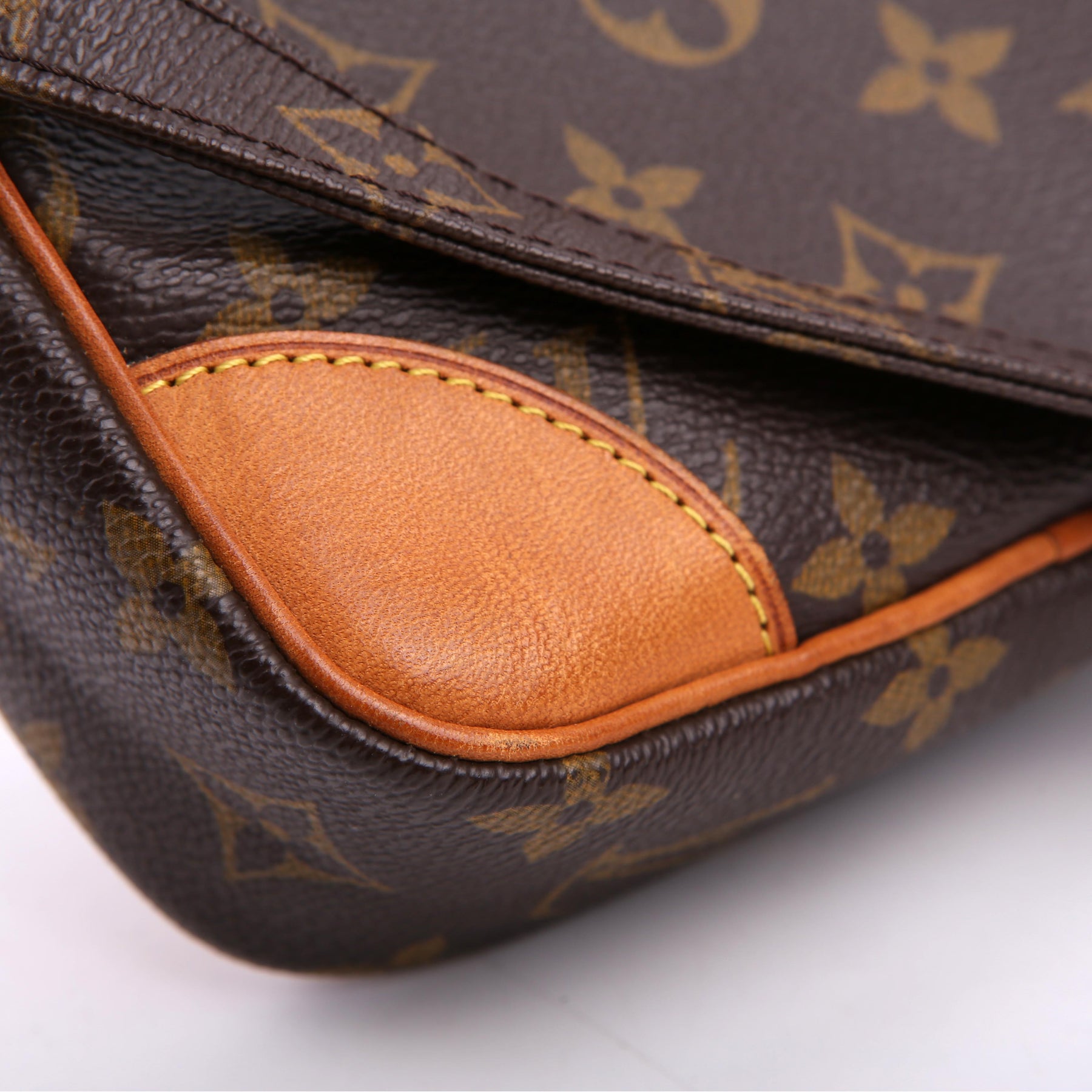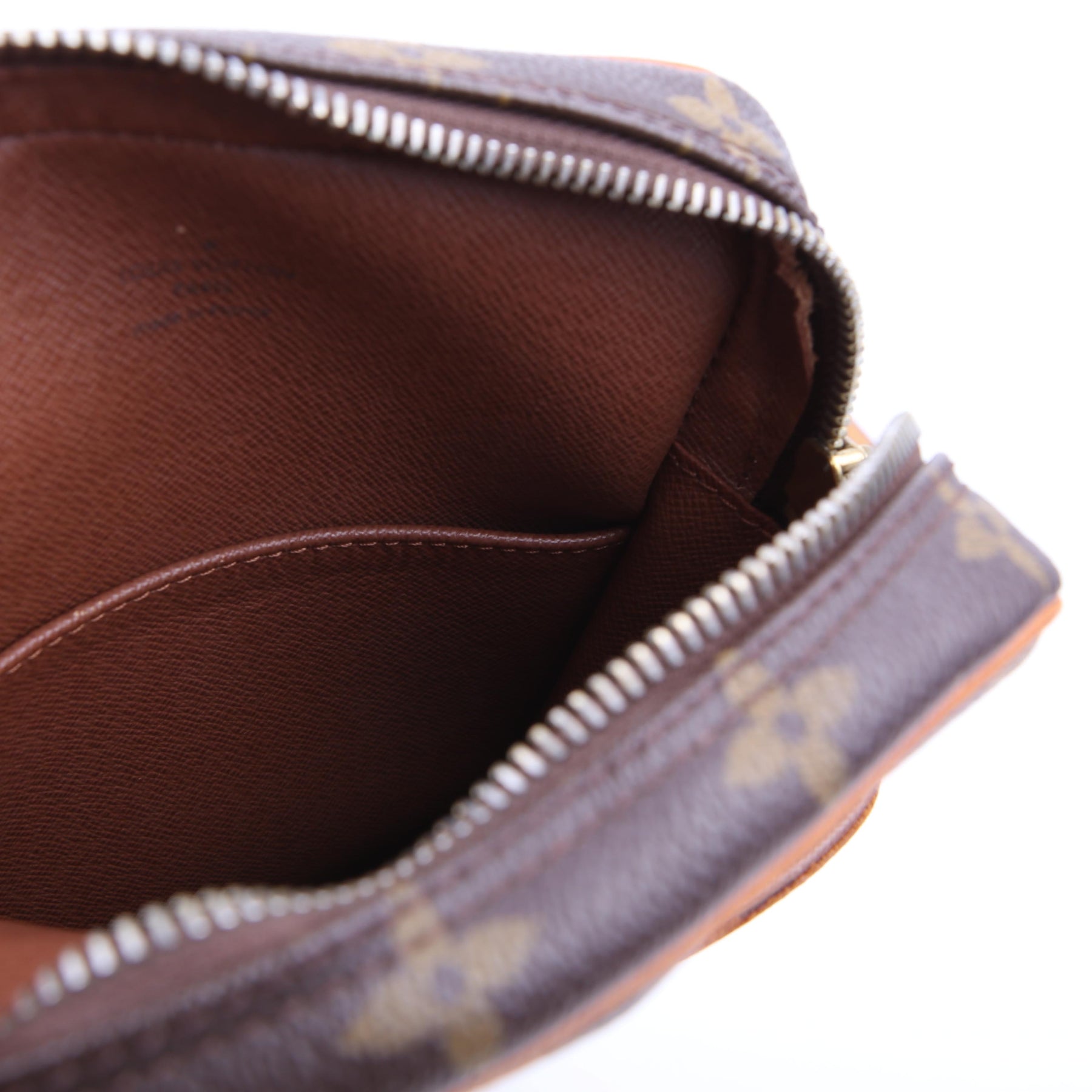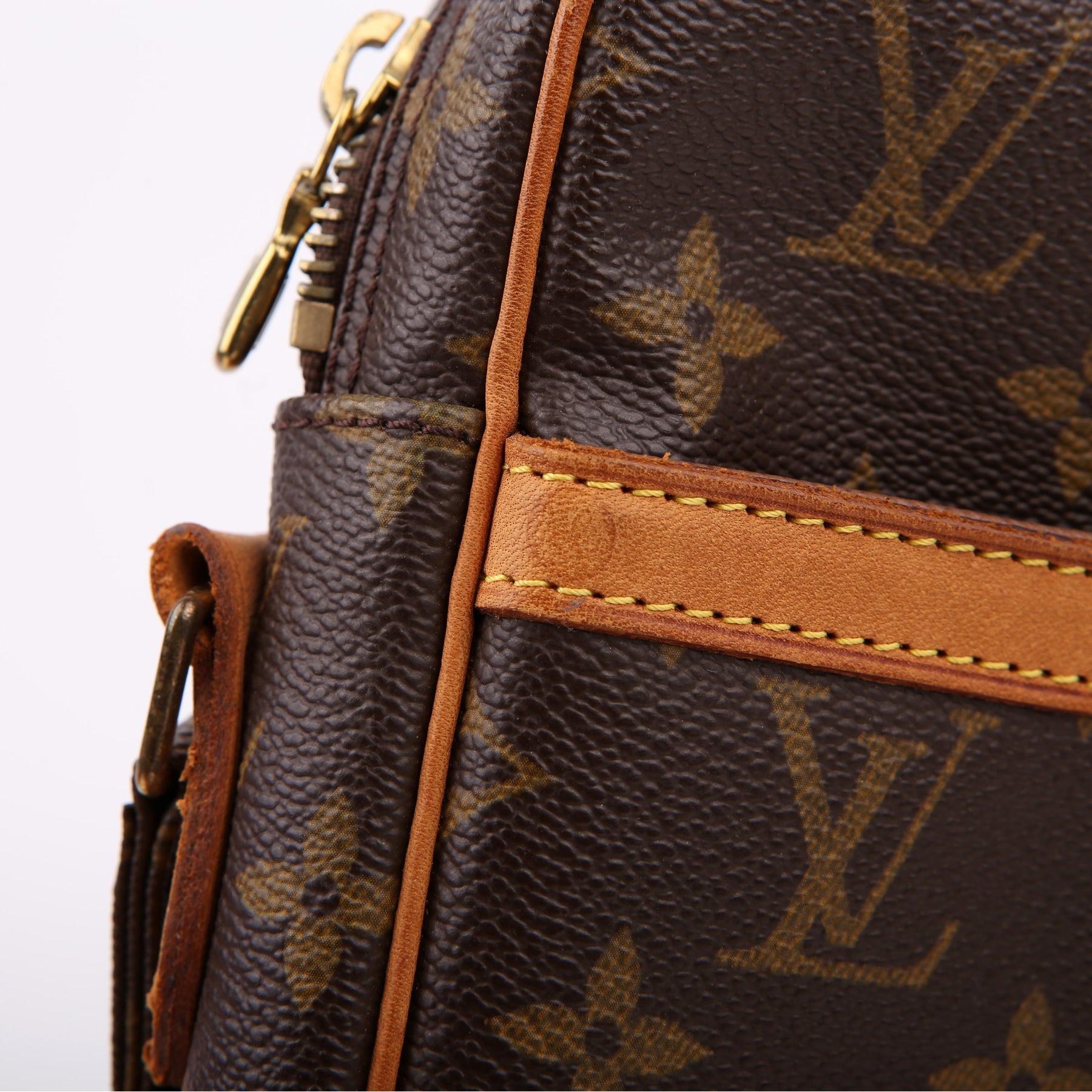 This pre-owned Louis Vuitton Danube is guaranteed 100% authentic. The exterior is in the classic Louis Vuitton Monogram coated canvas.