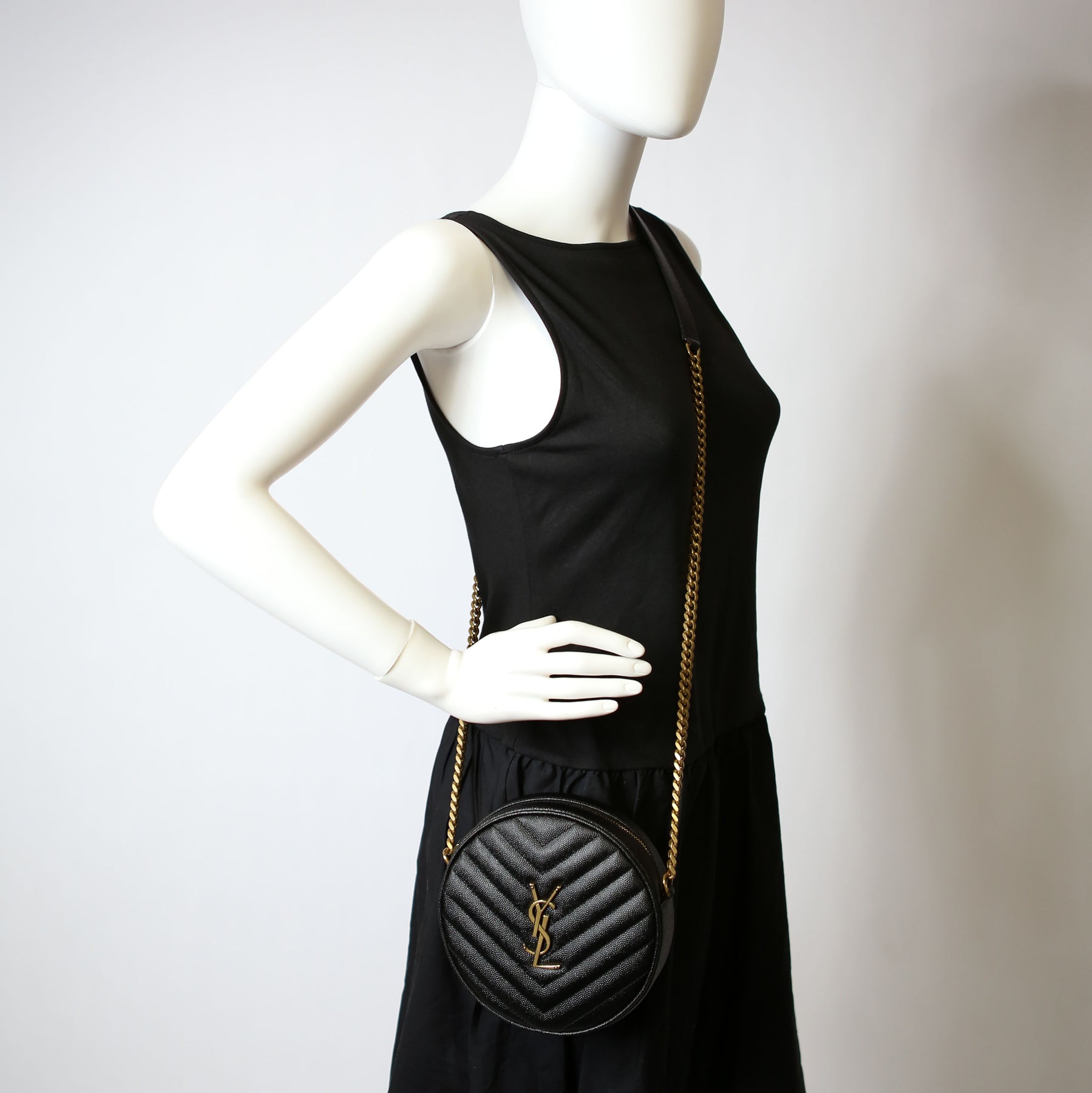 This pre-owned Saint Laurent Round Camera Bag is guaranteed 100% authentic. The exterior is in the classic Saint Laurent Grain De Poudre leather.