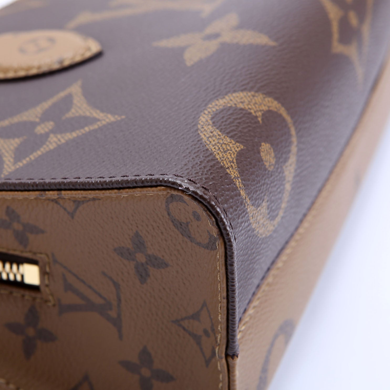 This pre-owned Louis Vuitton ONTHEGO East West Giant is guaranteed 100% authentic. The exterior is in the classic Louis Vuitton Reverse Monogram coated canvas.