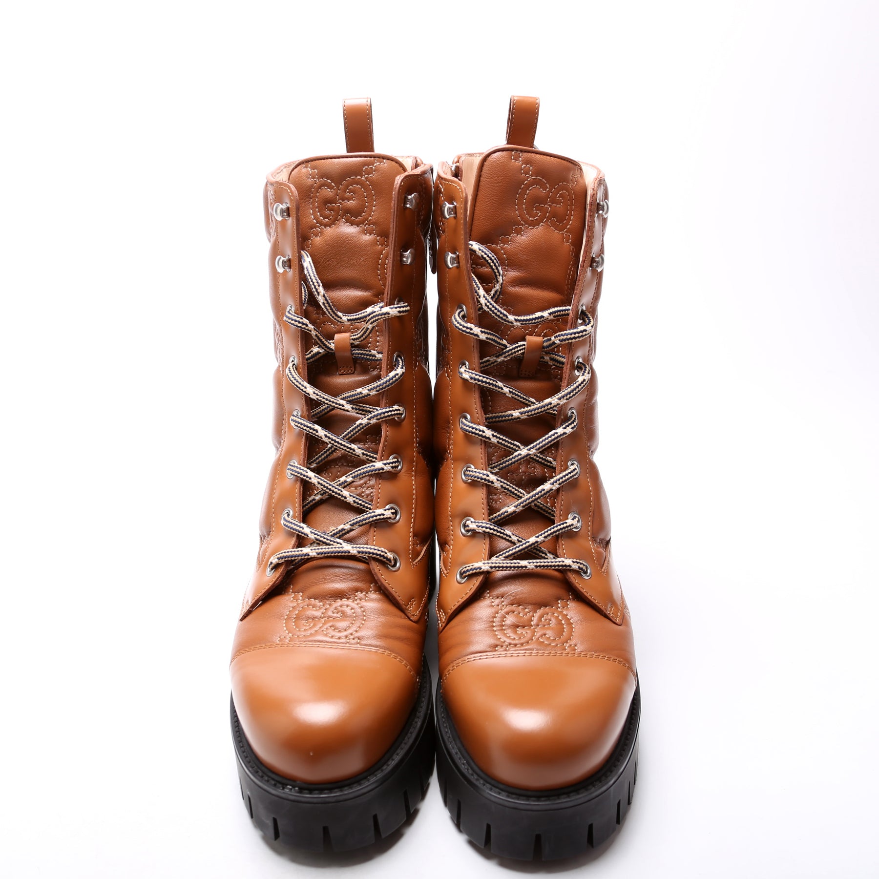 These pre-owned Gucci GG Matelasse Lace Up Boots are guaranteed 100% authentic.
