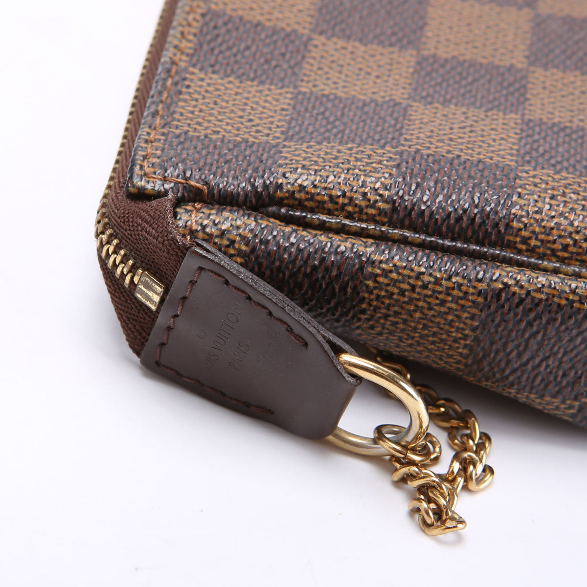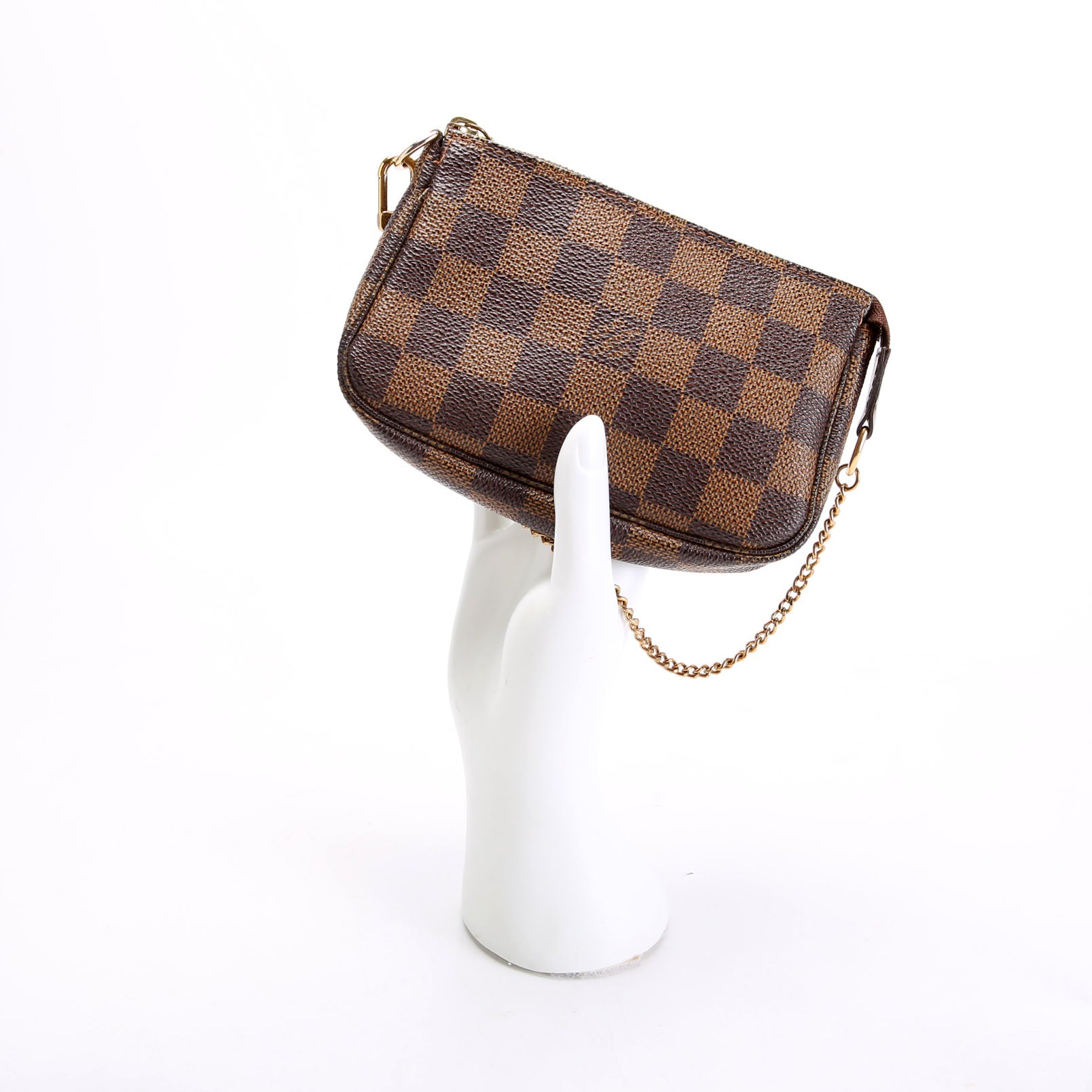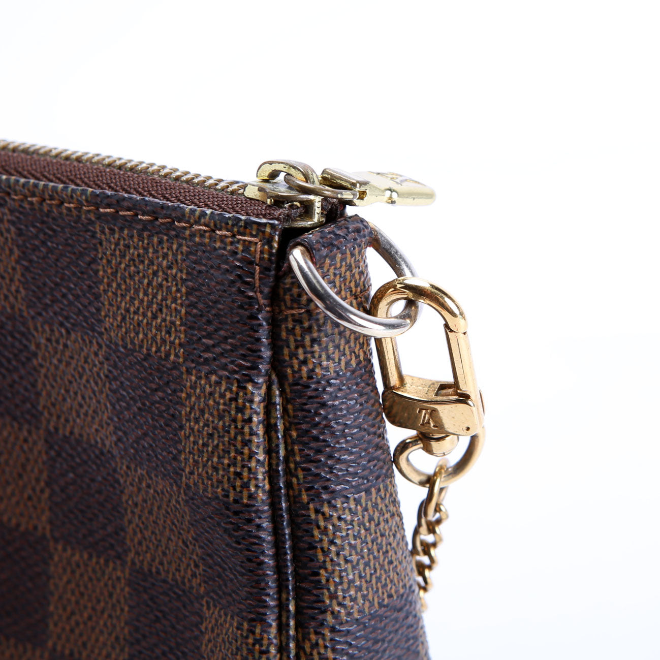 This pre-owned Louis Vuitton Pochette Access Mini Ebene is guaranteed 100% authentic. The exterior is in the classic Louis Vuitton Ebene coated canvas.