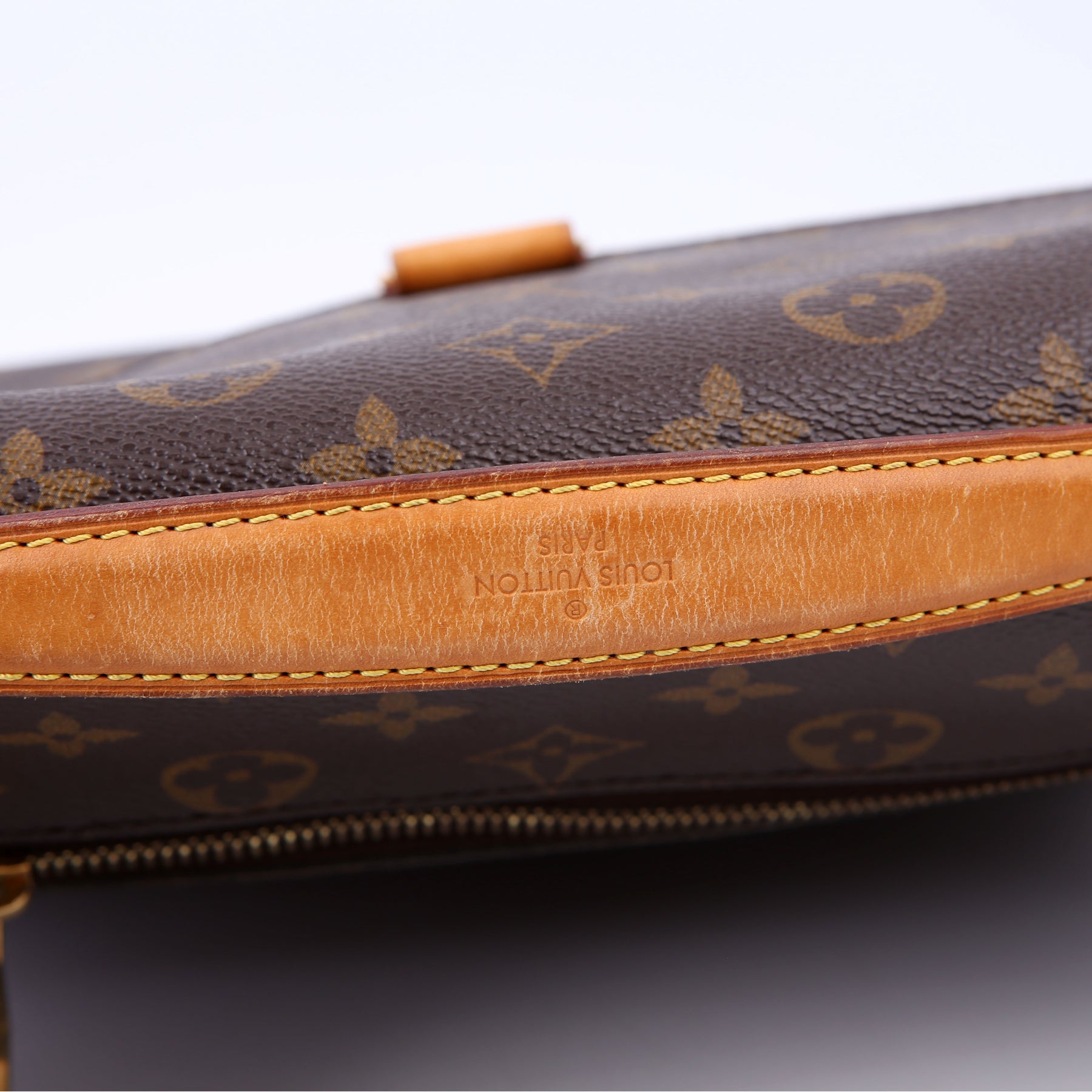 Exterior: The exterior shows minor wear throughout. The leather tabs show minor wear and discoloration. The exterior features one zipper pocket.