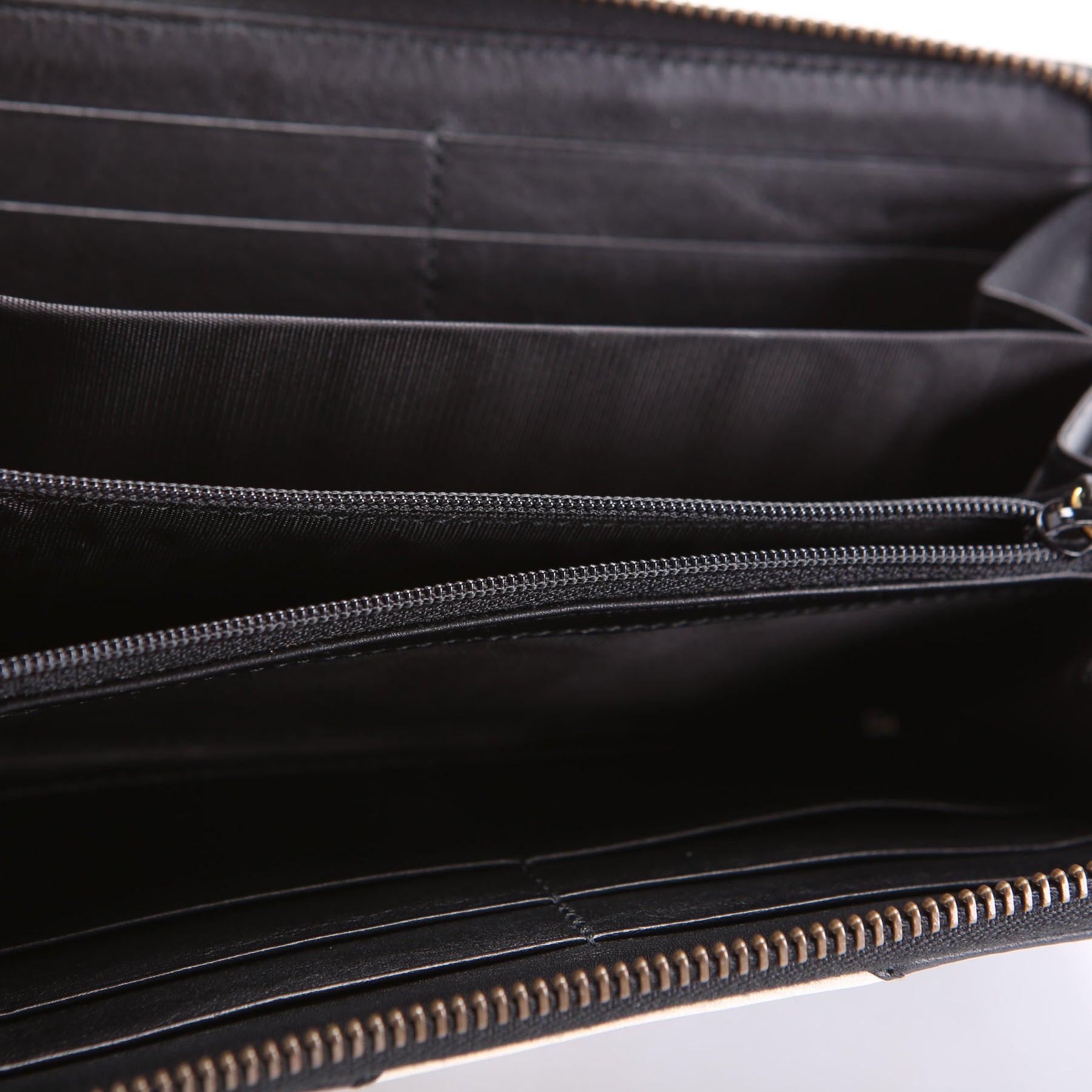 Interior: The interior shows light indentions to the leather. It features twelve card slots, three open pockets, and one zip closure pocket.
