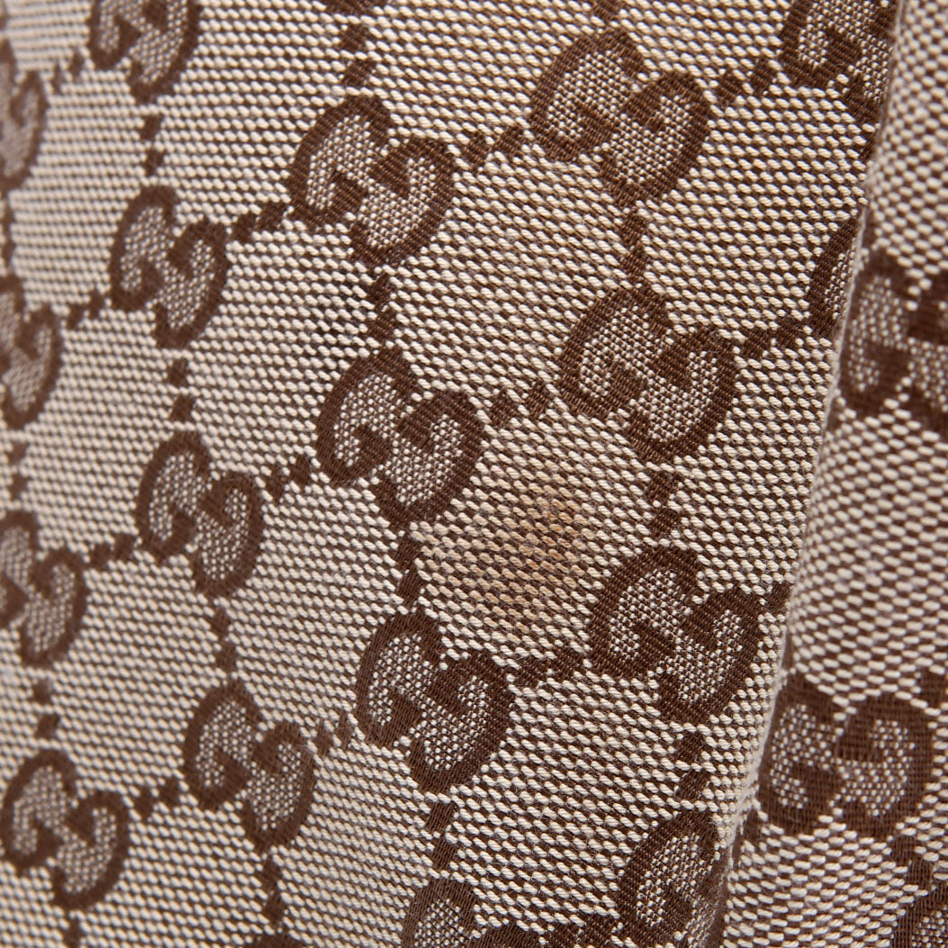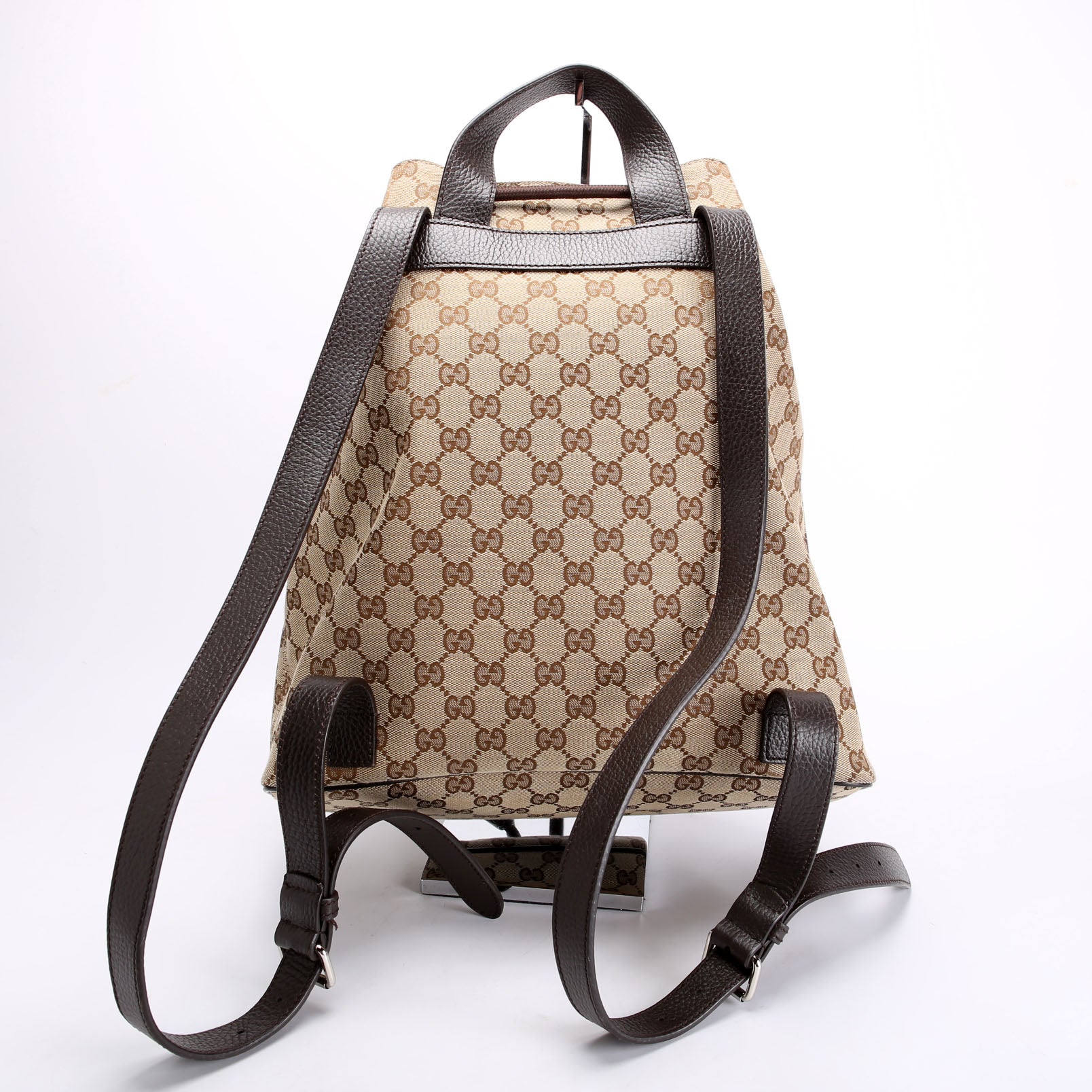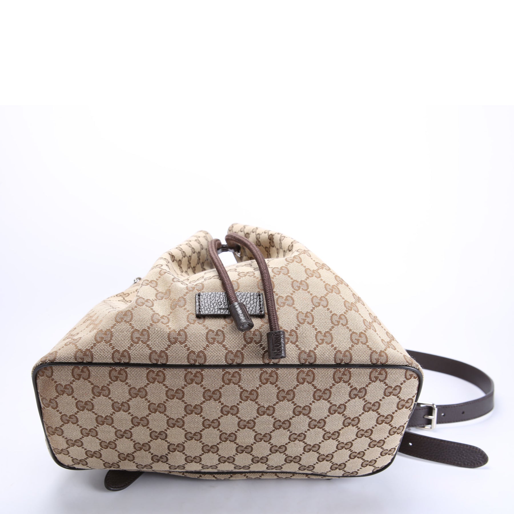 This pre-owned Gucci Drawstring Backpack is guaranteed 100% authentic. The exterior is in the classic Gucci Canvas.