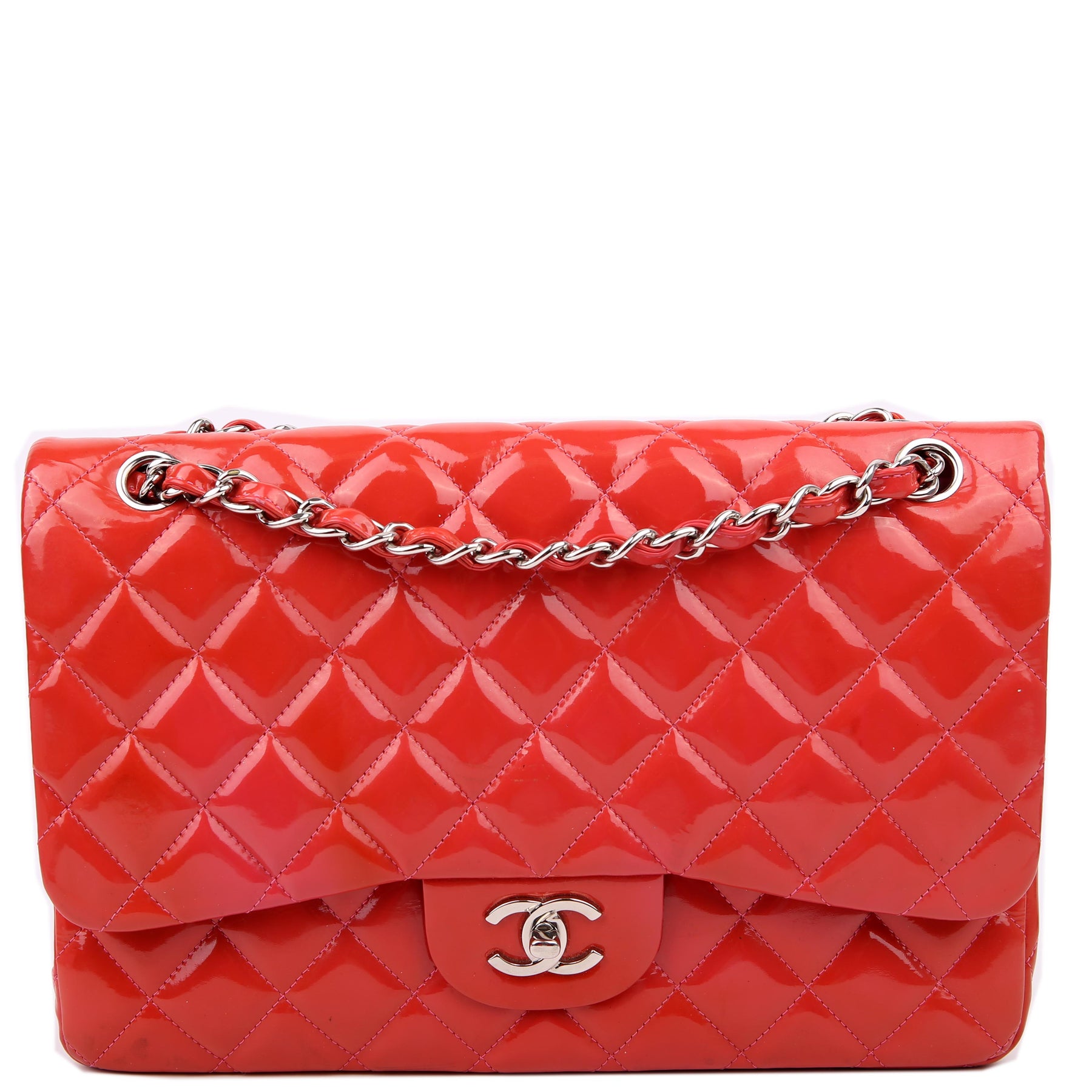 This pre-owned Chanel Classic Flap Jumbo Patent is guaranteed 100% authentic.