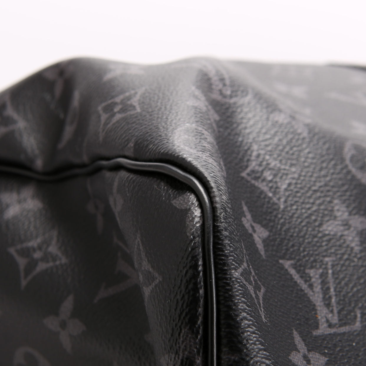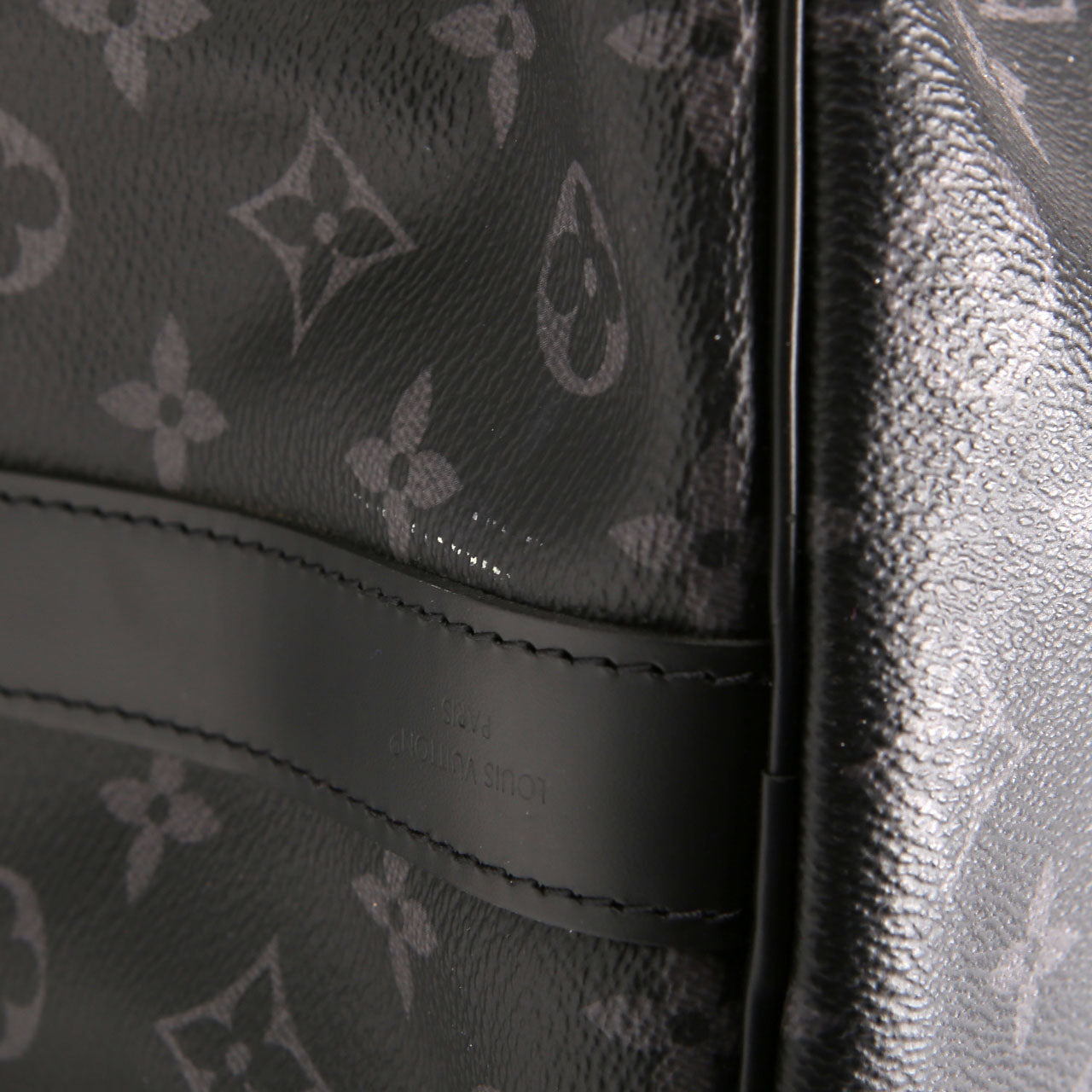 This pre-owned Keepall 50 Bandouliere is guaranteed 100% authentic. The exterior is in the classic Louisv Vuitton Monogram Eclipse Coated Canvas.