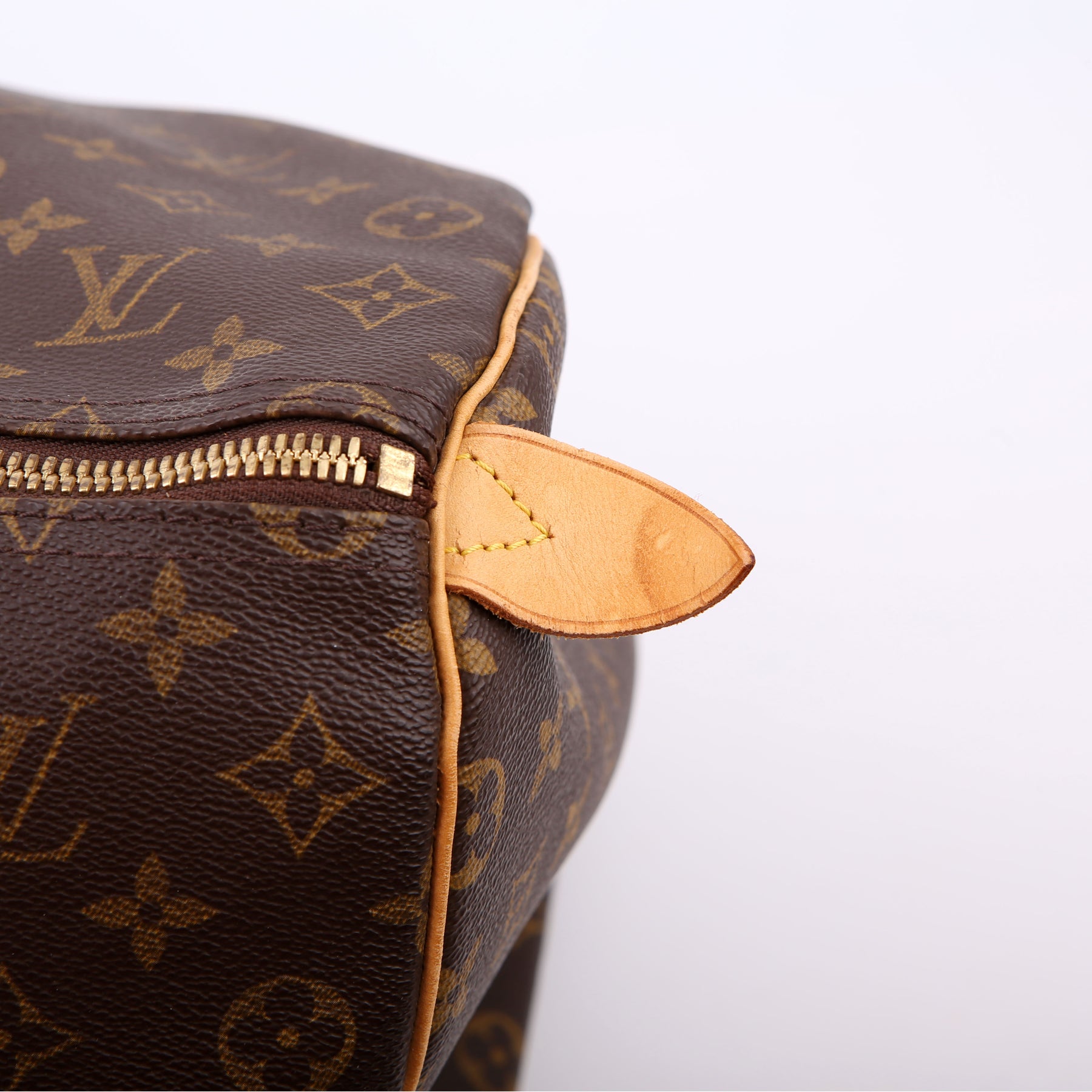 Exterior: The exterior canvas is free from wear. The leather trim has discoloration and wear throughout. The logo tab has minor cracks.