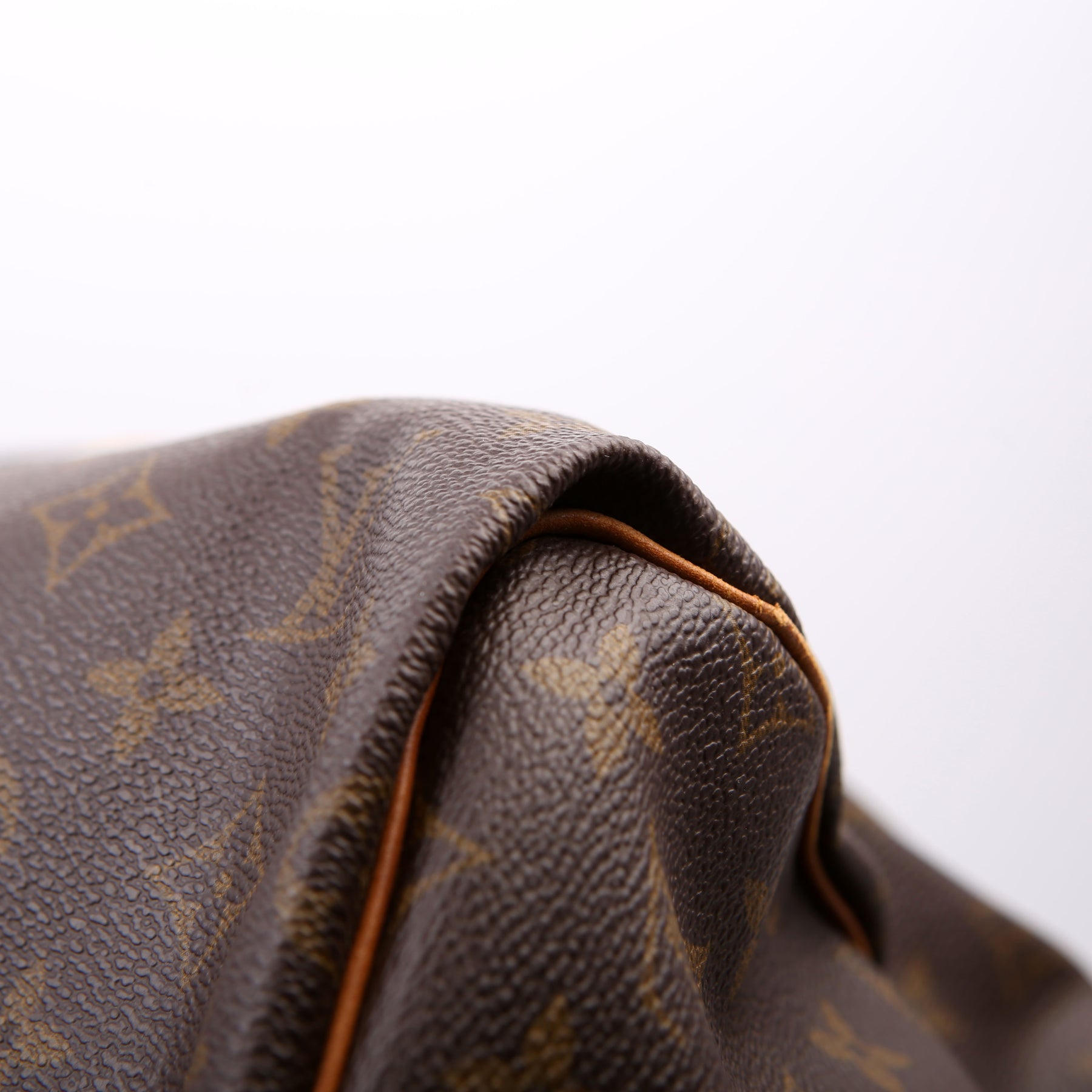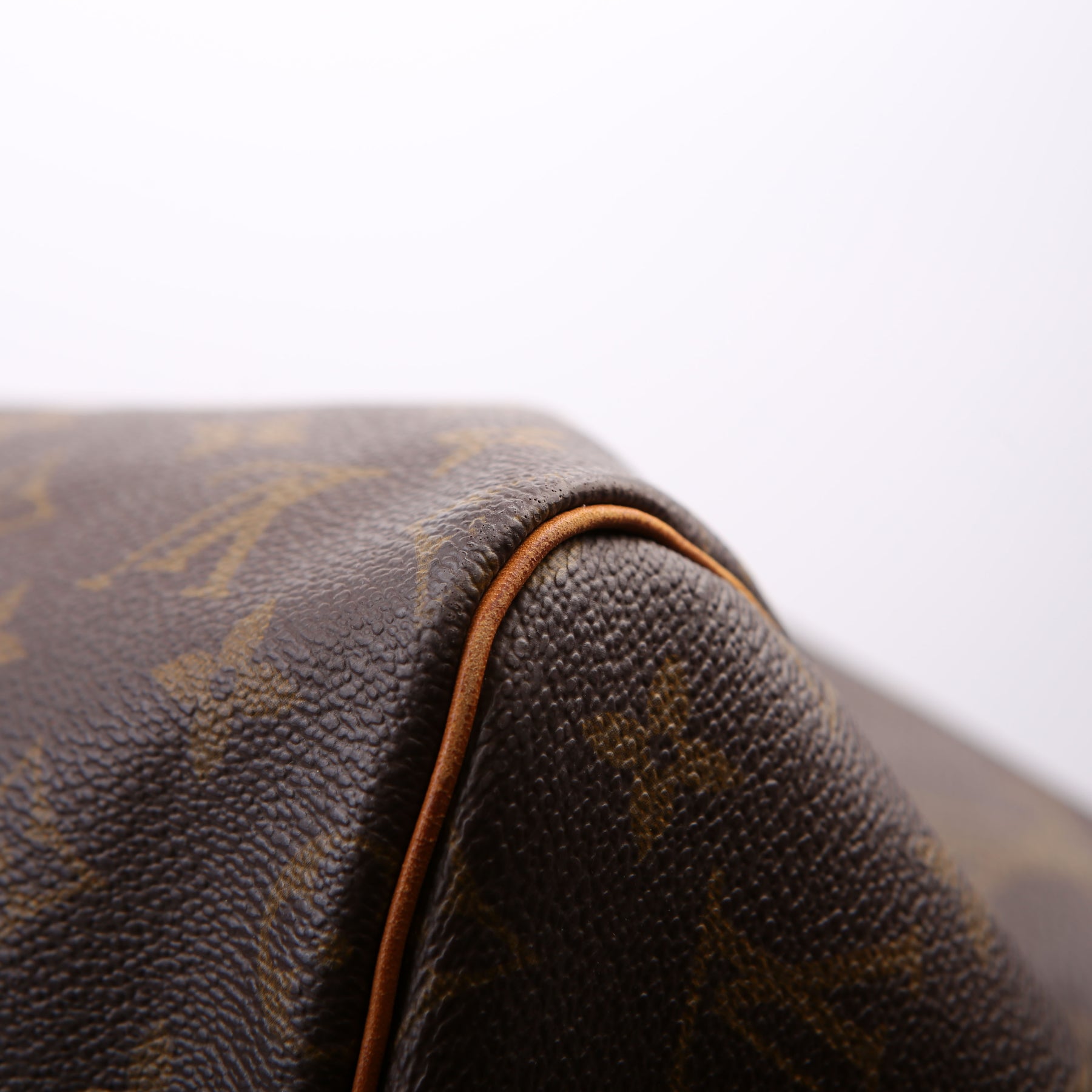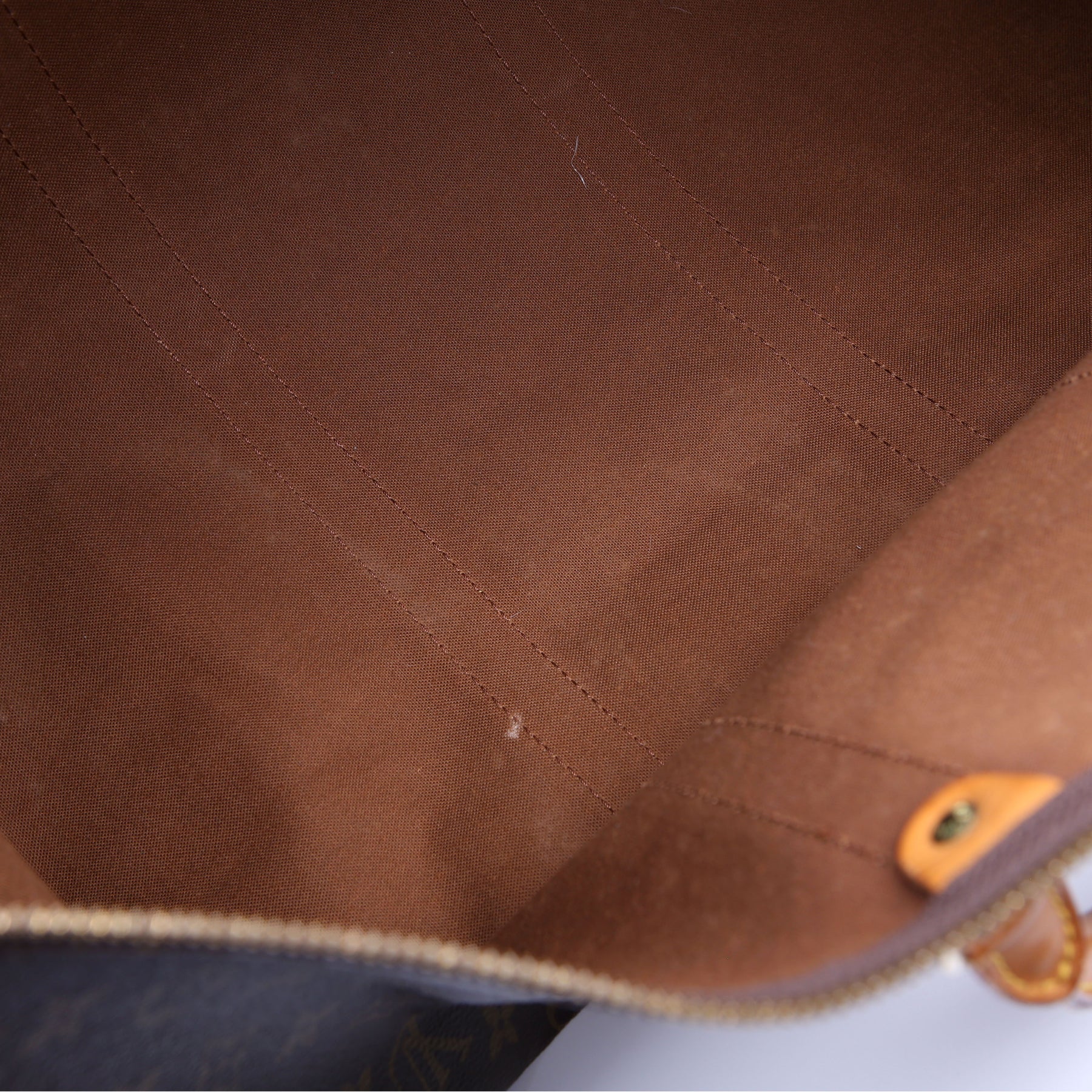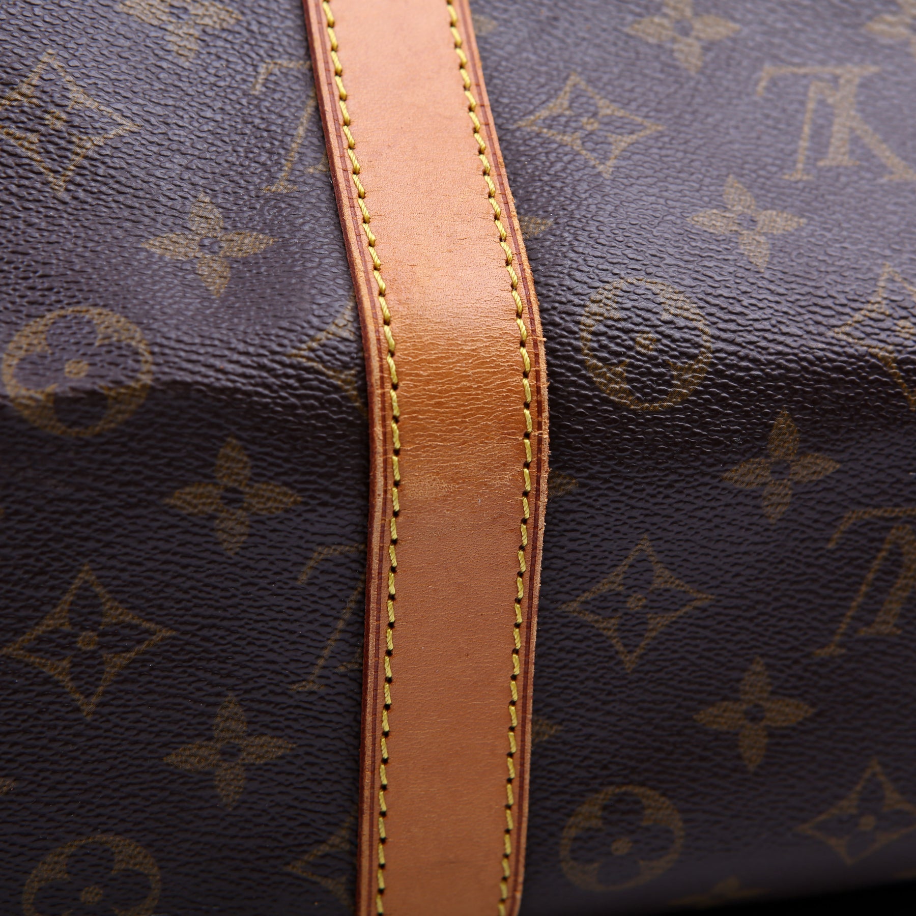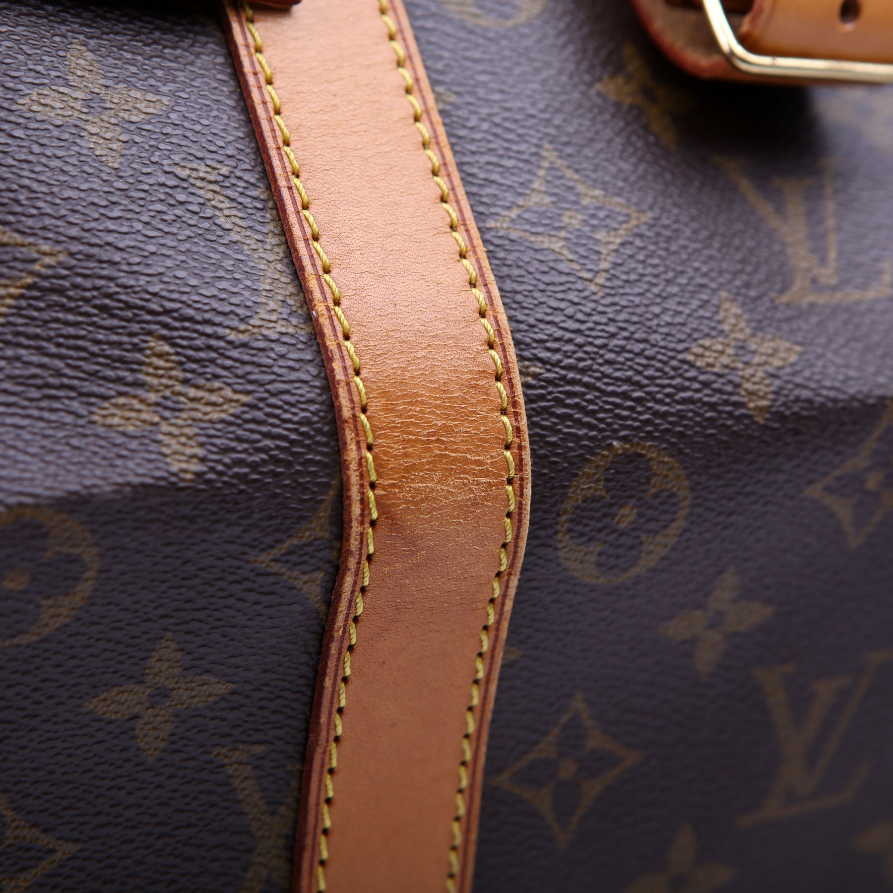This pre-owned Louis Vuitton Keepall 55 is guaranteed 100% authentic. The exterior is in the classic Louis Vuitton Monogram coated canvas.