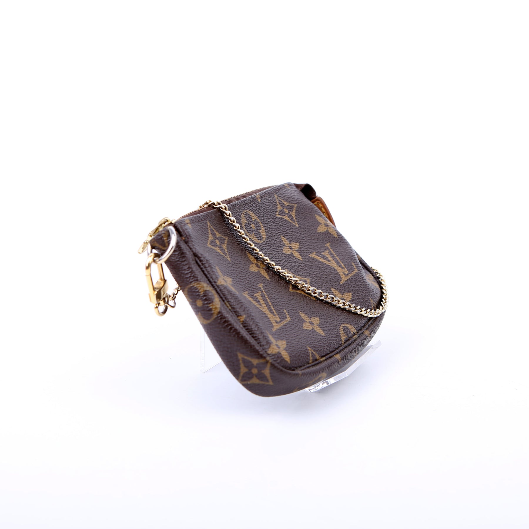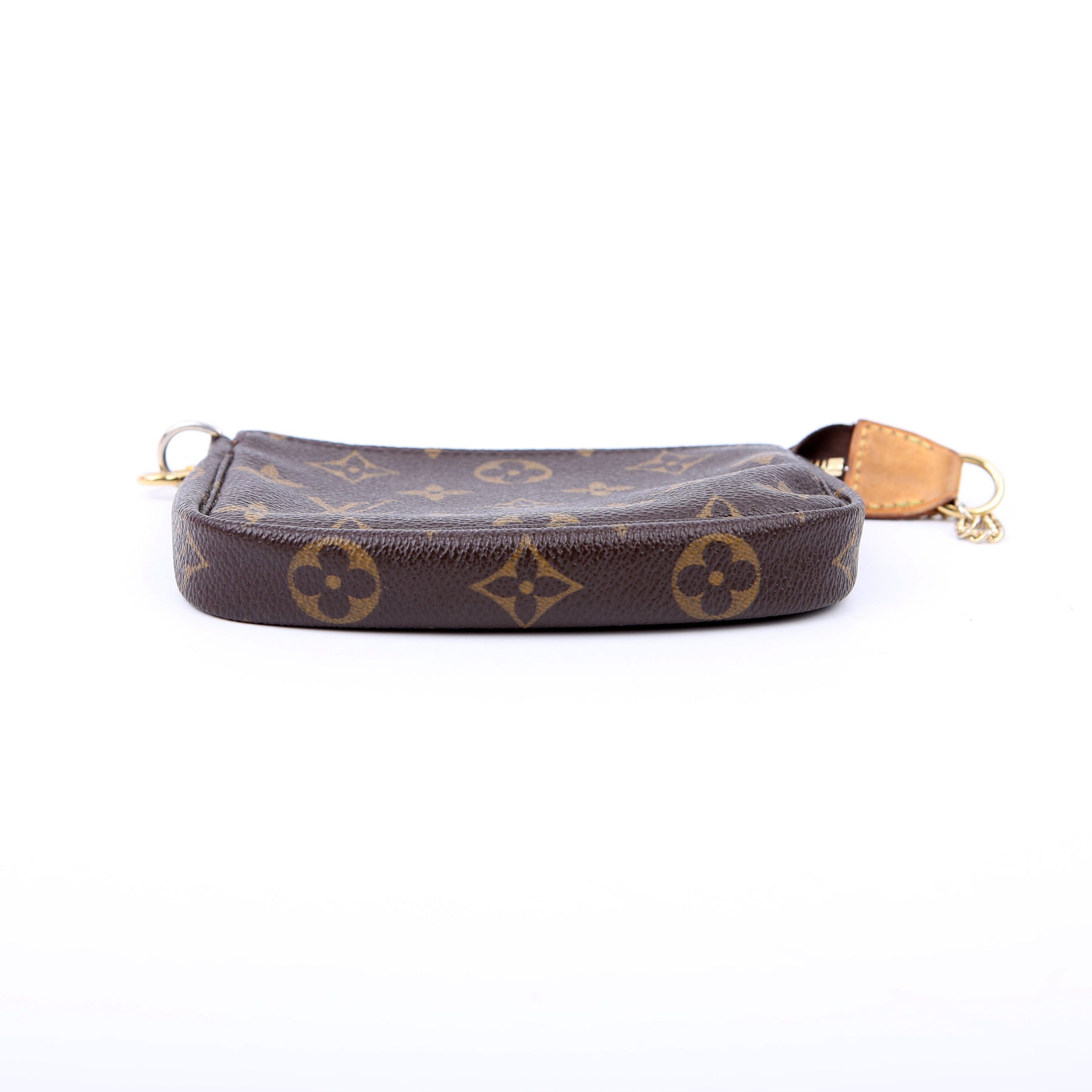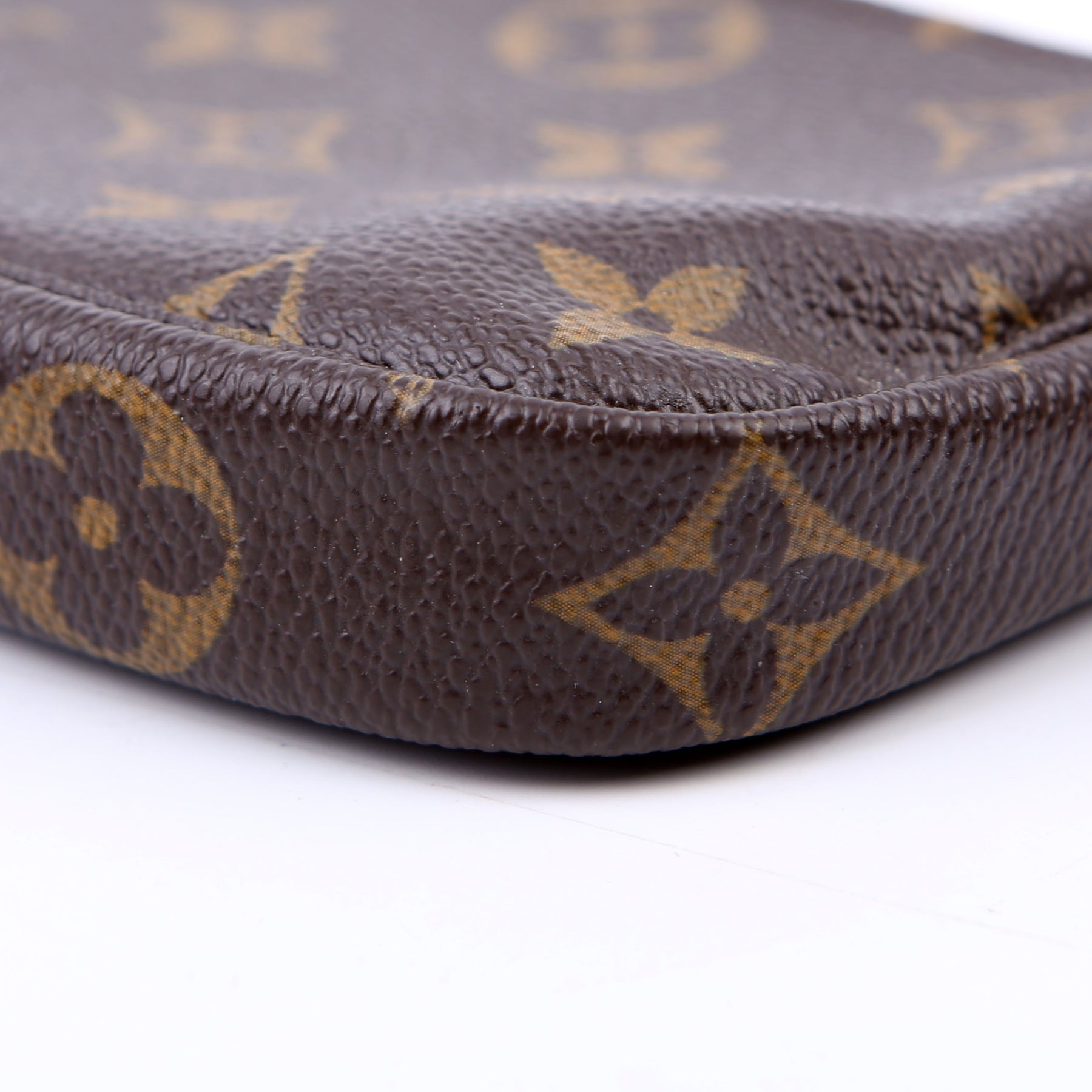 This pre-owned Louis Vuitton Pochette Accessories Mini is guaranteed 100% authentic. The exterior is in the classic Louis Vuitton Monogram coated canvas.