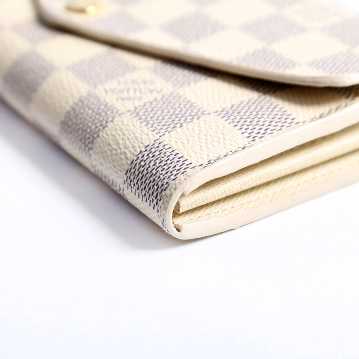 This pre-owned Louis Vuitton Sarah Wallet is guaranteed 100% authentic. The exterior is in the classic Louis Vuitton Damier Azur coated canvas.