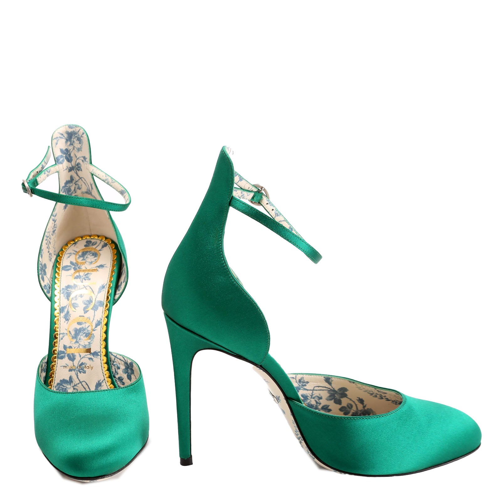 These pre-owned Gucci Satin Daisy Ankle Strap 105 Pumps are guaranteed 100% authentic.