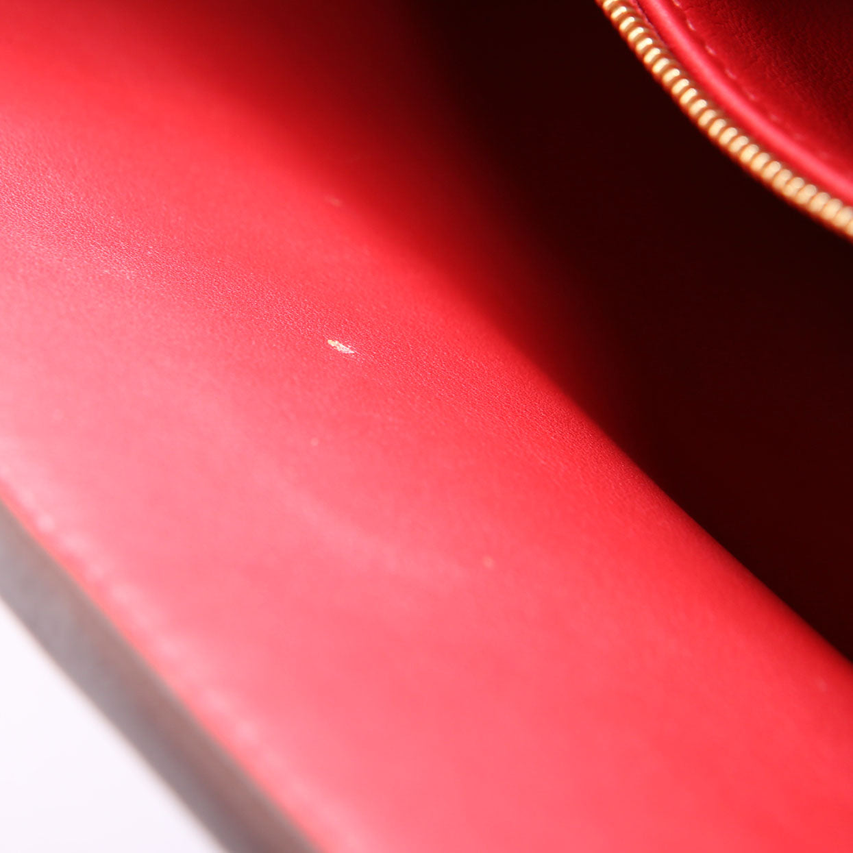 Interior: The interior shows scuffs and scratches to the leather. It features one zip closure pocket.