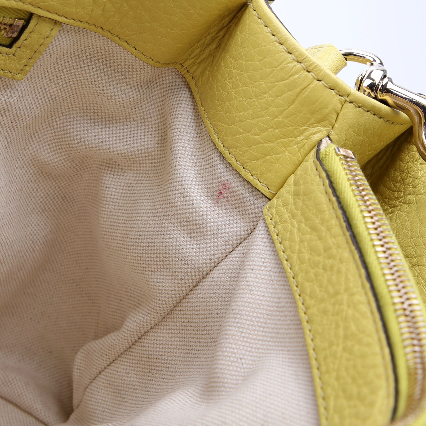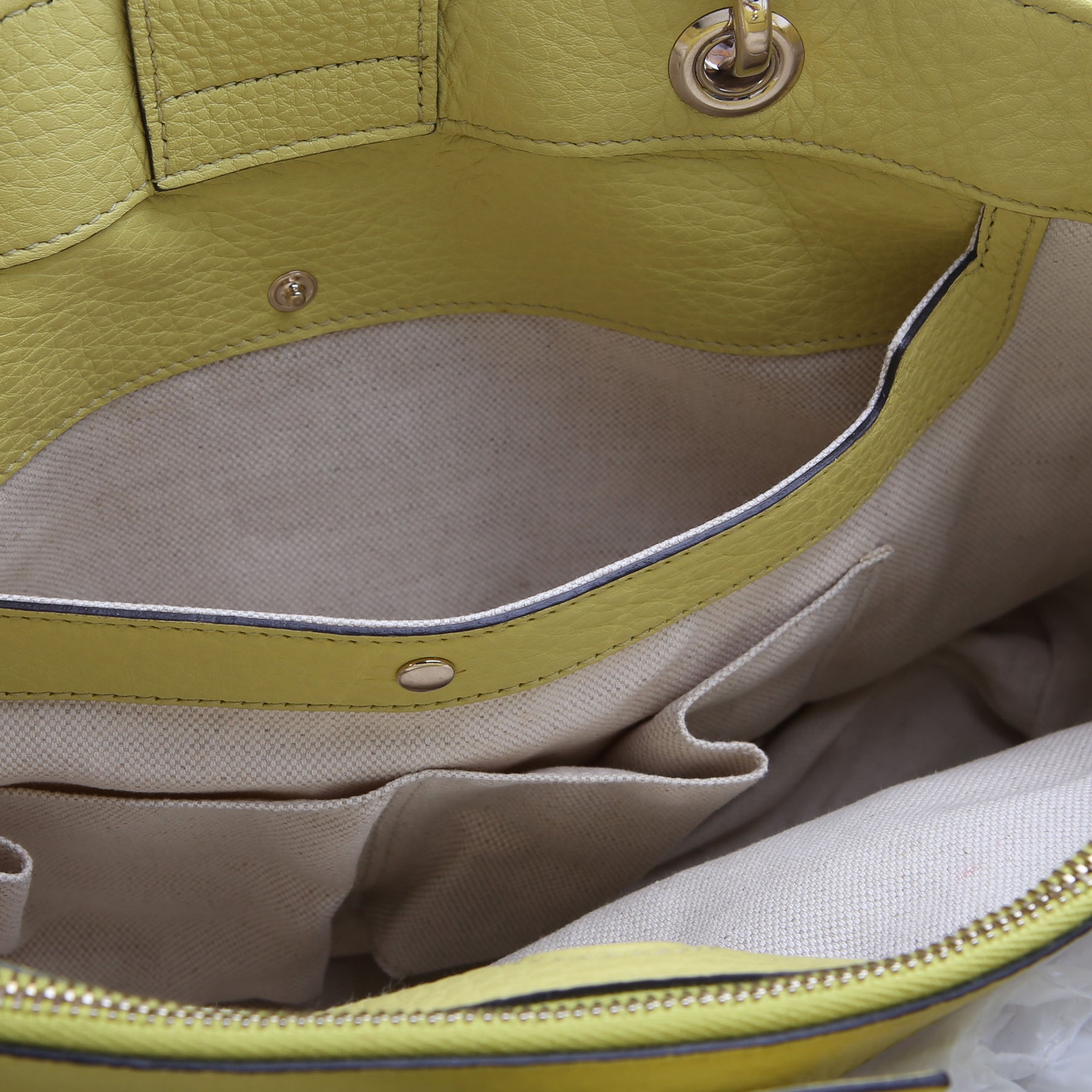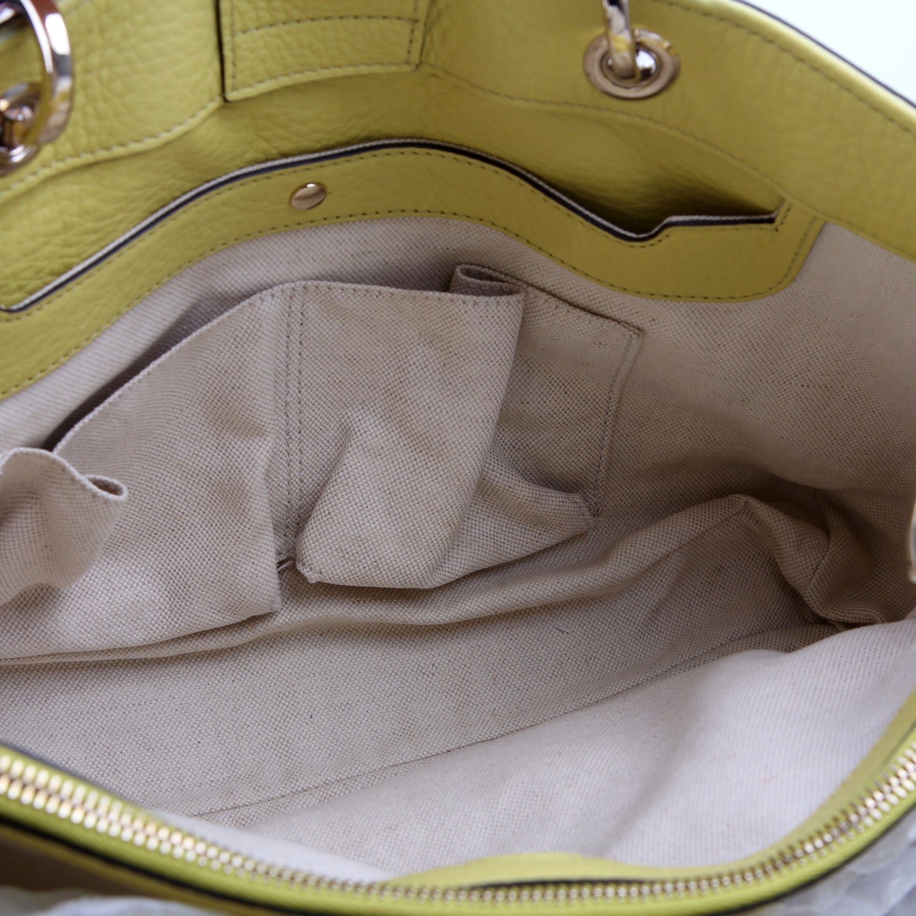 Interior: The interior is clean, and features two magnetic closure sections, one zipper section, two open pockets, one snap closure pocket, and one zipper pocket.