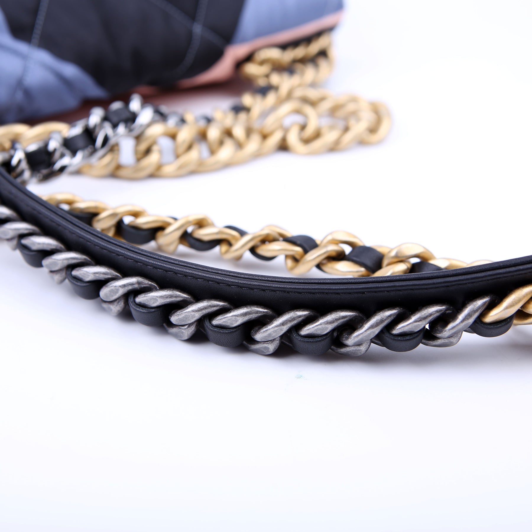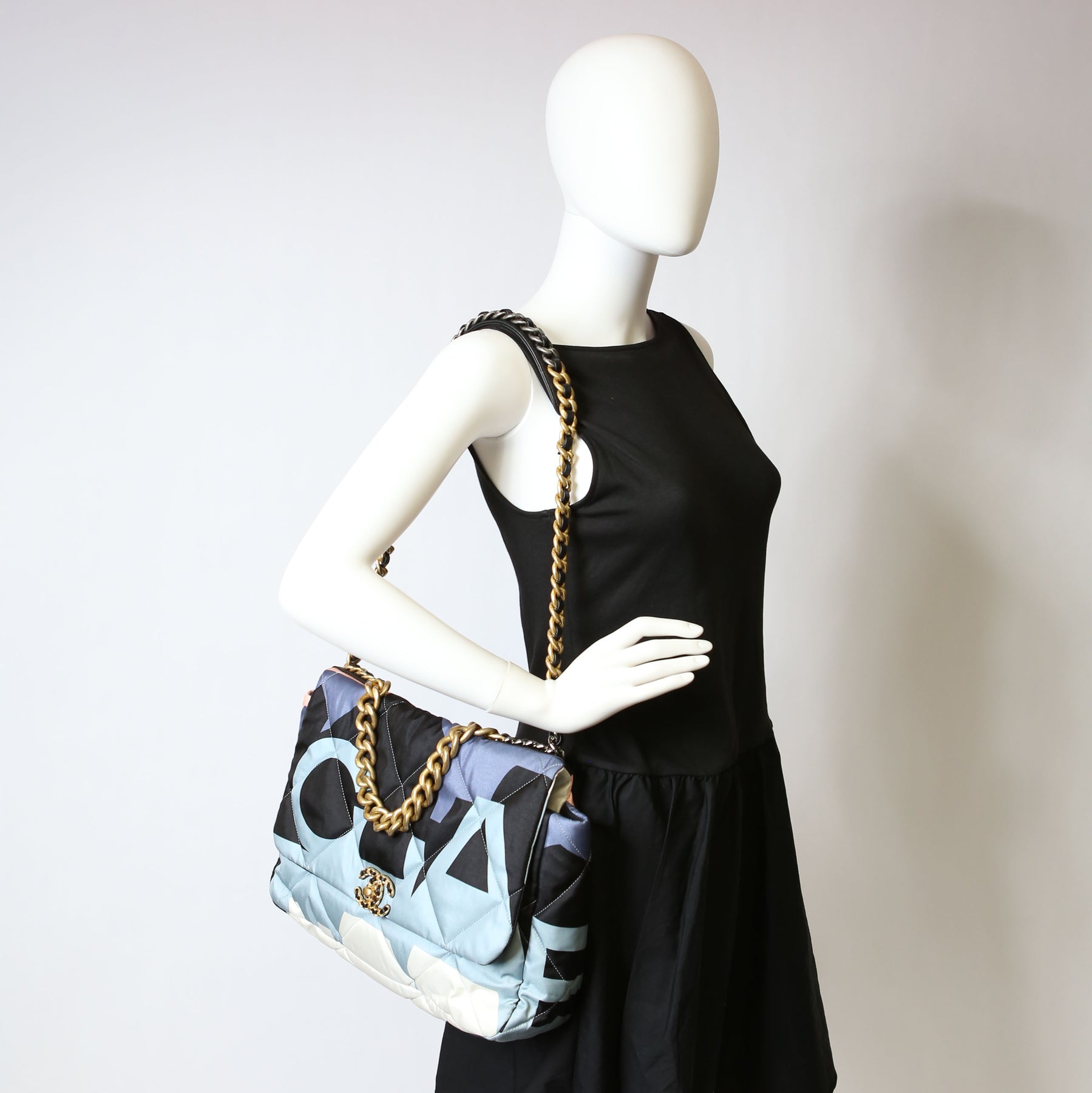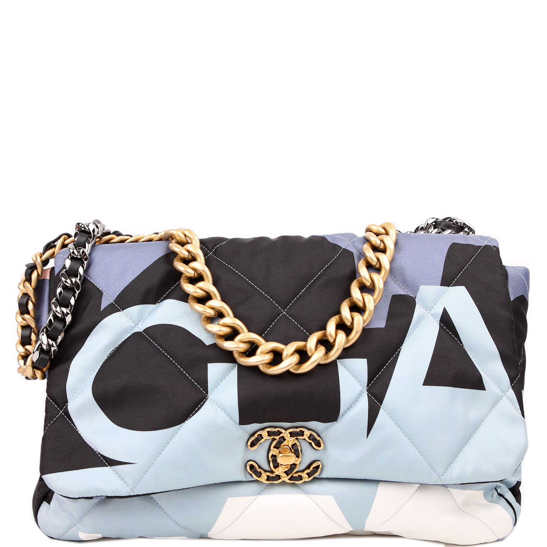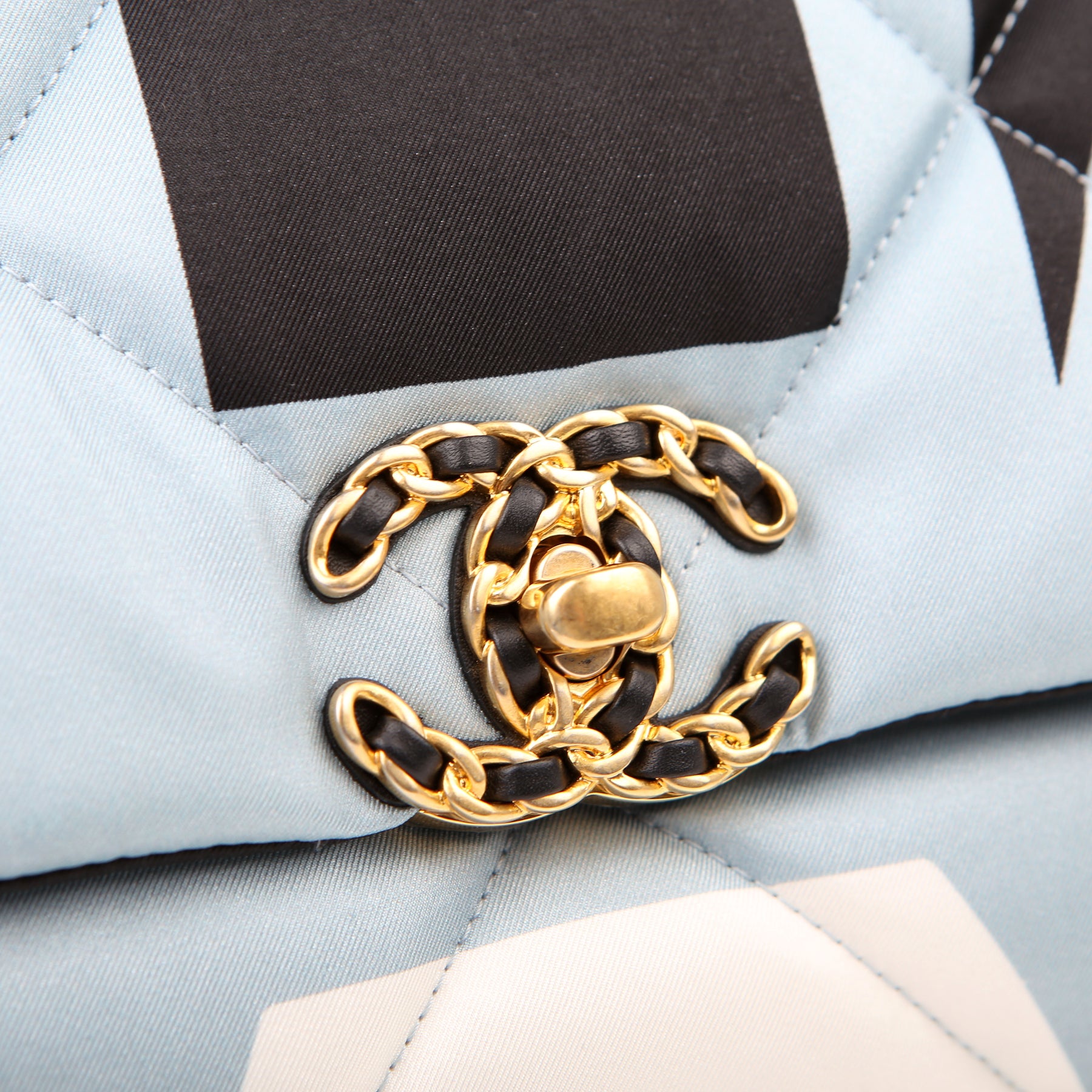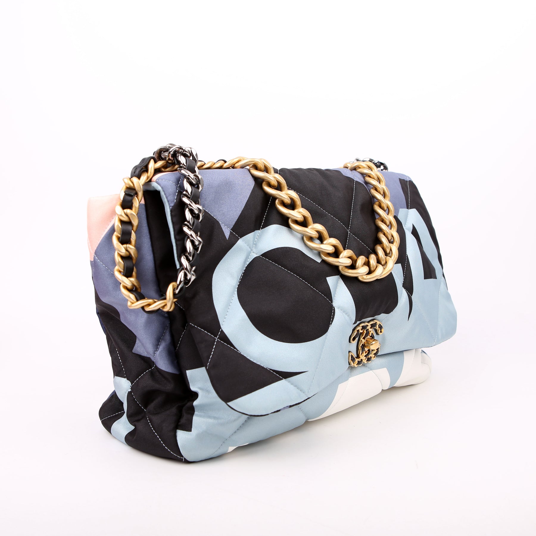 This pre-owned Chanel Chanel 19 Maxi Flap is guaranteed 100% authentic. The exterior is in the classic Chanel Silk Scarf.