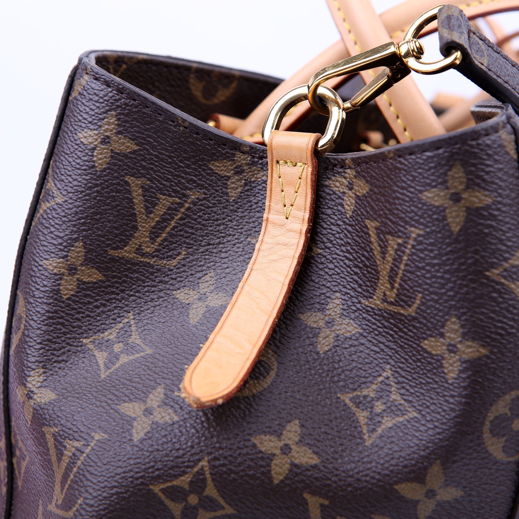 Handles: The leather handles have minor wear and discoloration. The leather key chain shows minor wear and discoloration.