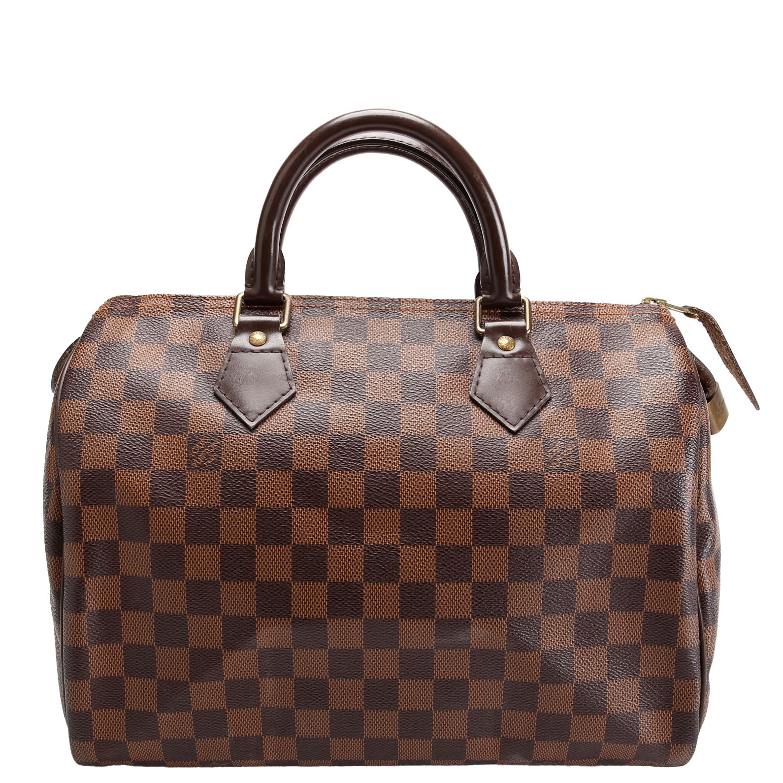 This pre-owned Louis Vuitton Speedy 30 is guaranteed 100% authentic. The exterior is in the classic Louis Vuitton Damier Ebene coated canvas.