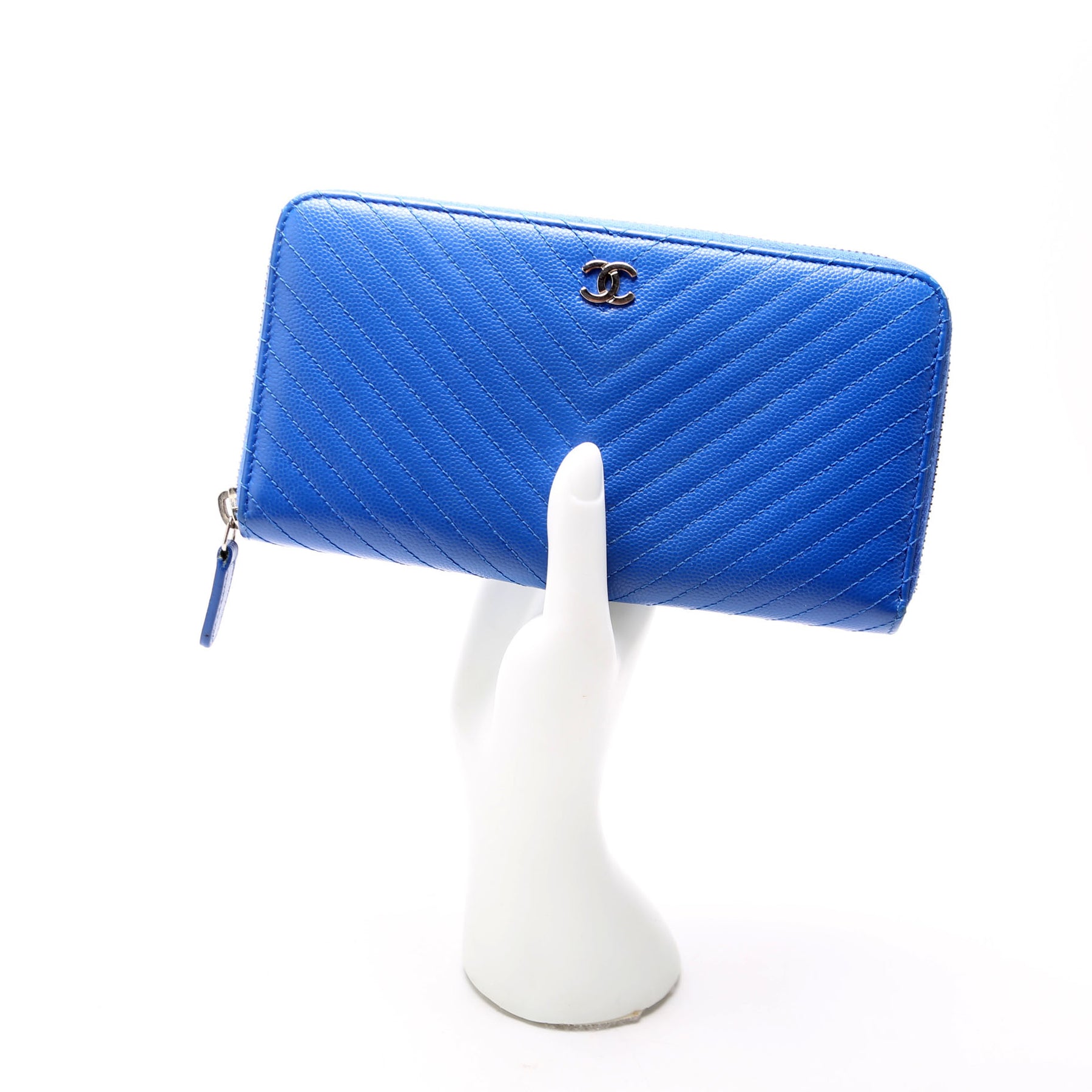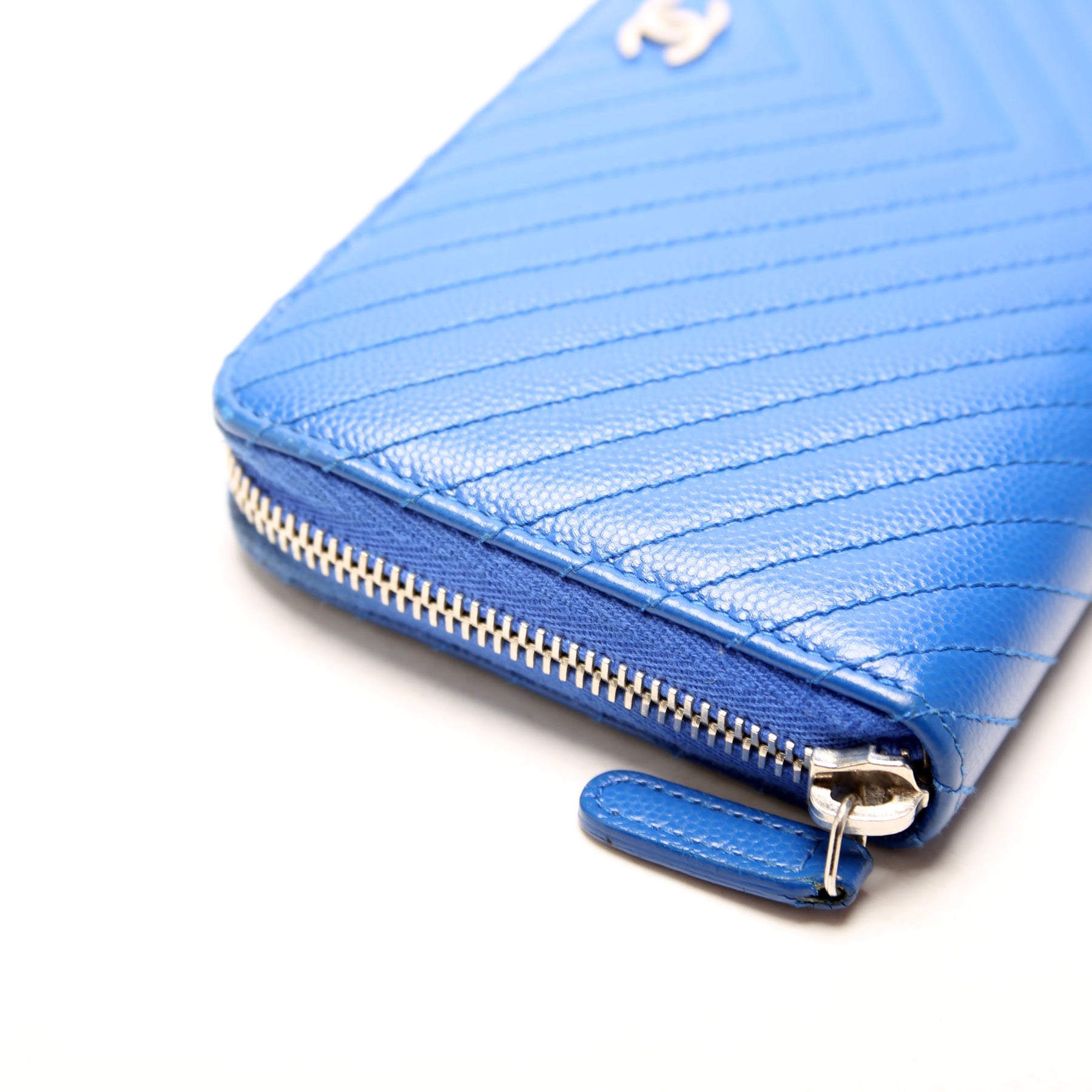 This pre-owned Chanel Chevron Zip Around Wallet is guaranteed 100% authentic. The exterior is in the classic Caviar leather.