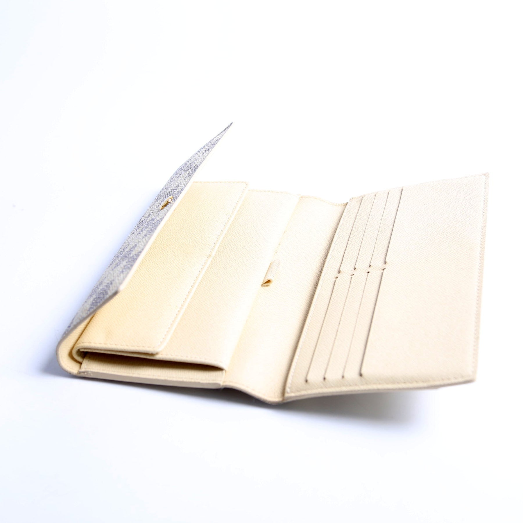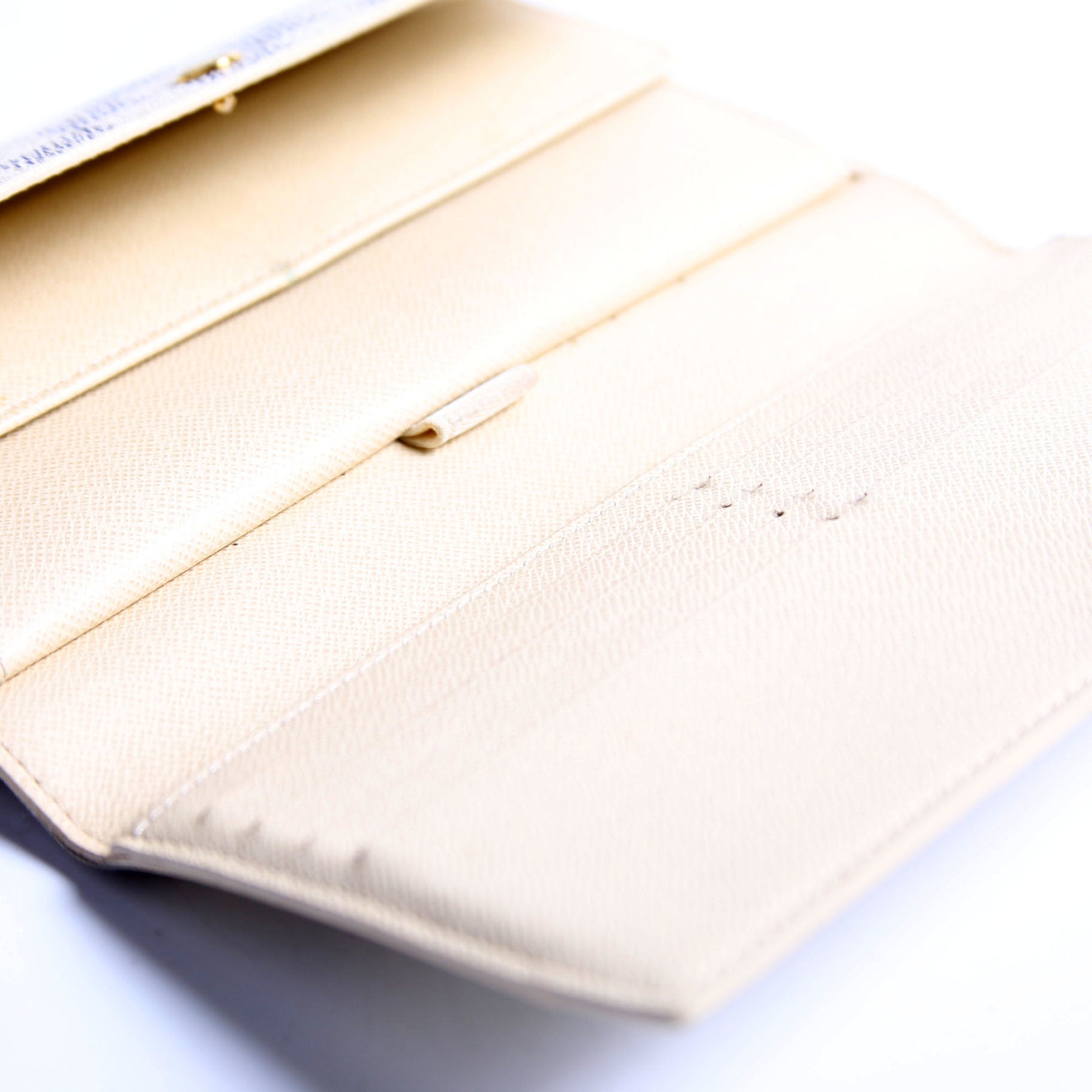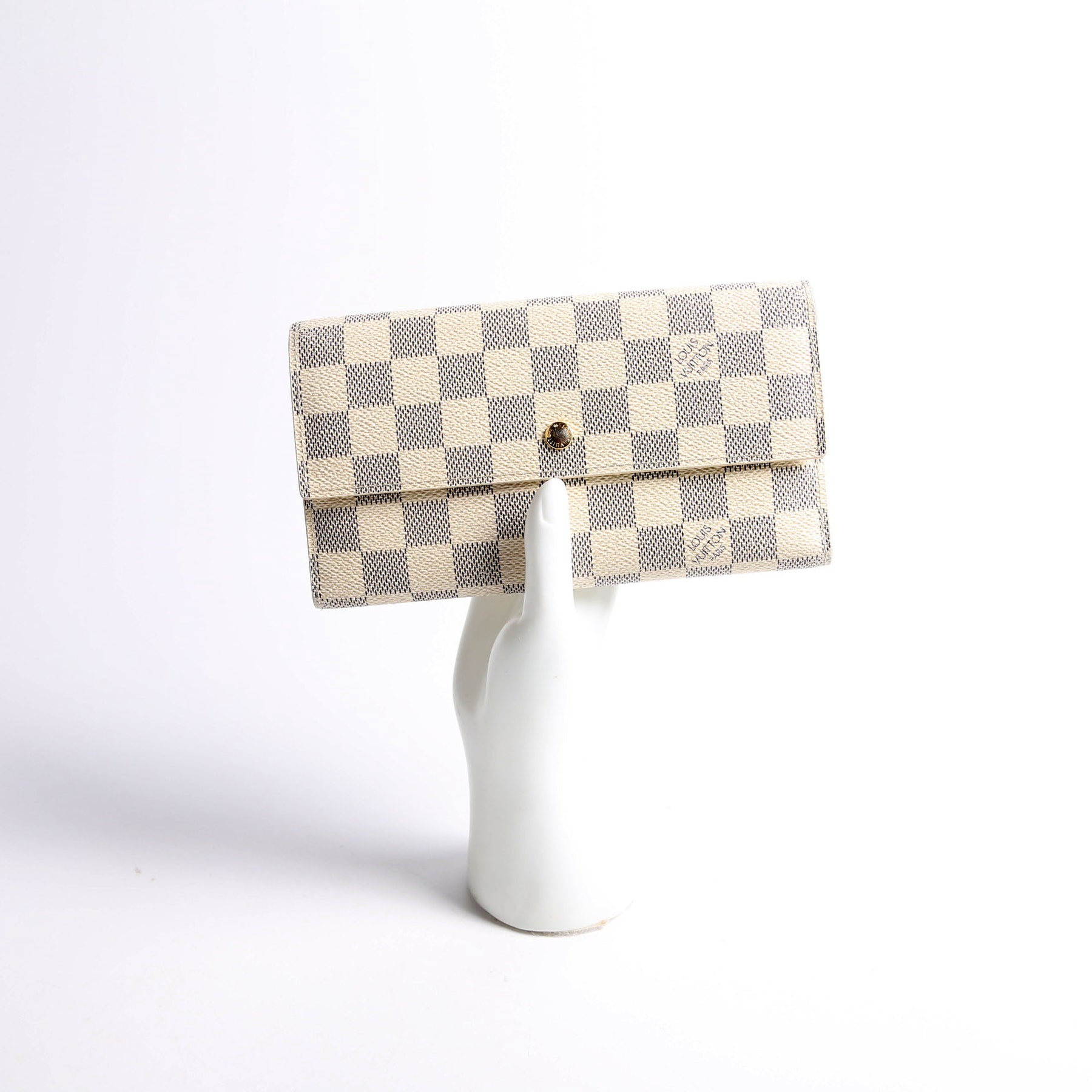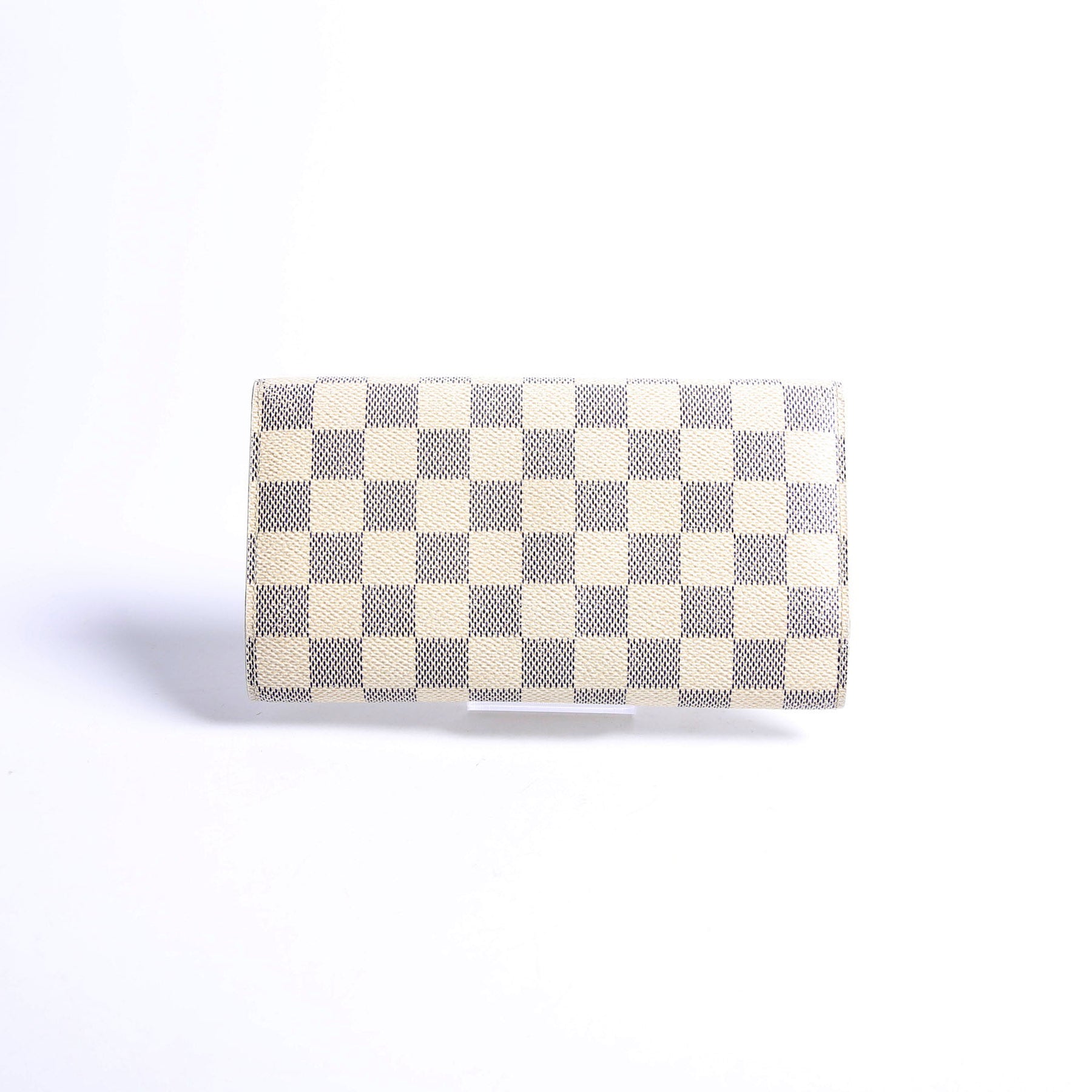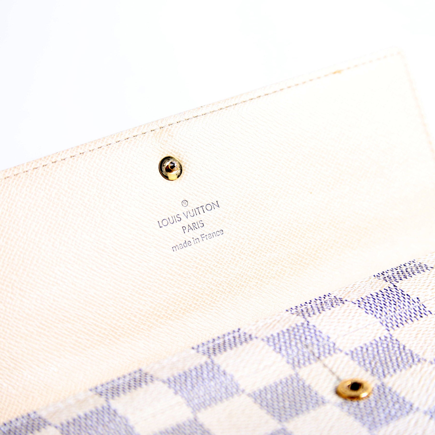 This pre-owned Louis Vuitton Sarah Wallet is guaranteed 100% authentic. The exterior is in the classic Louis Vuitton Damier Azur coated canvas.